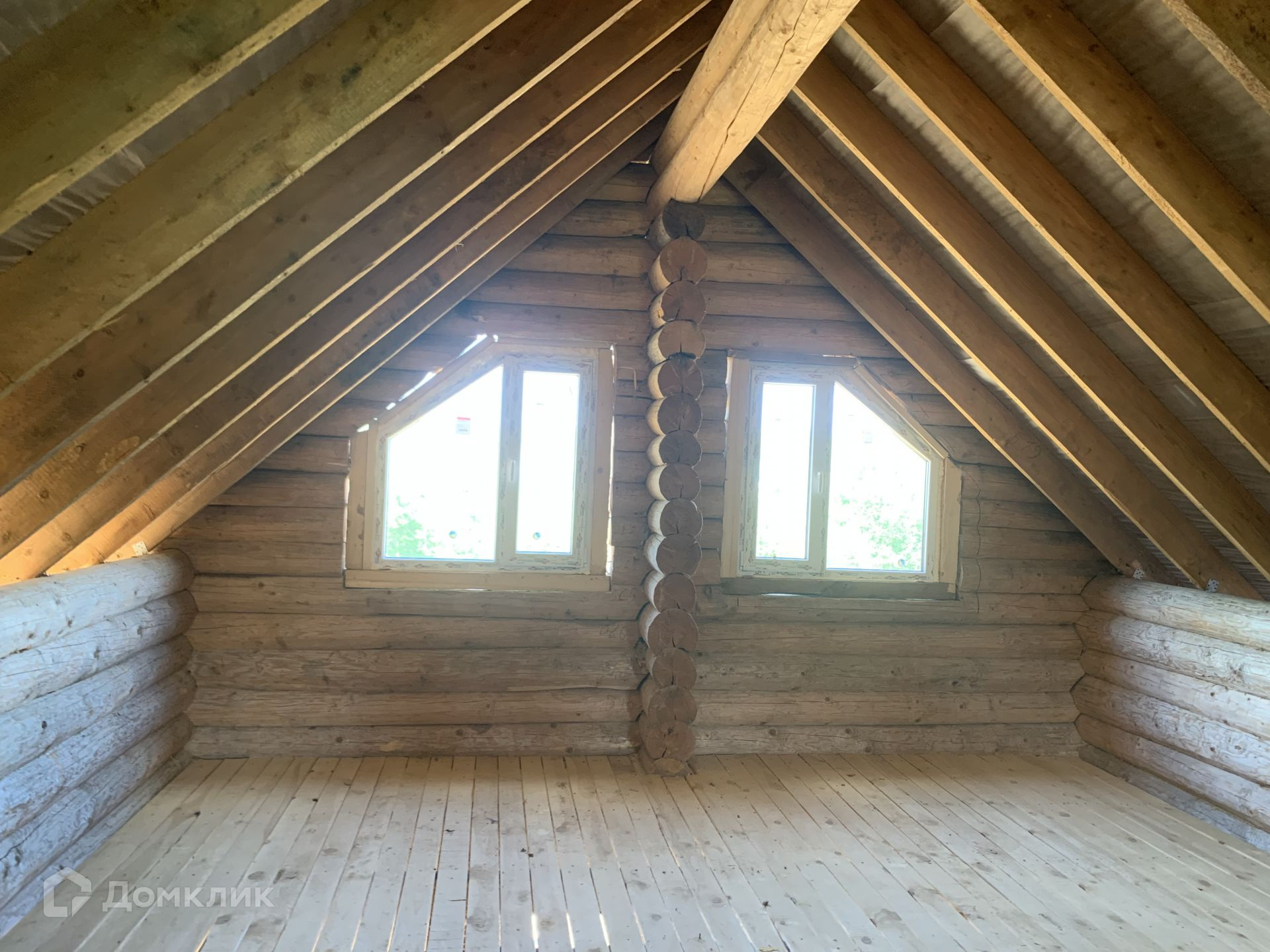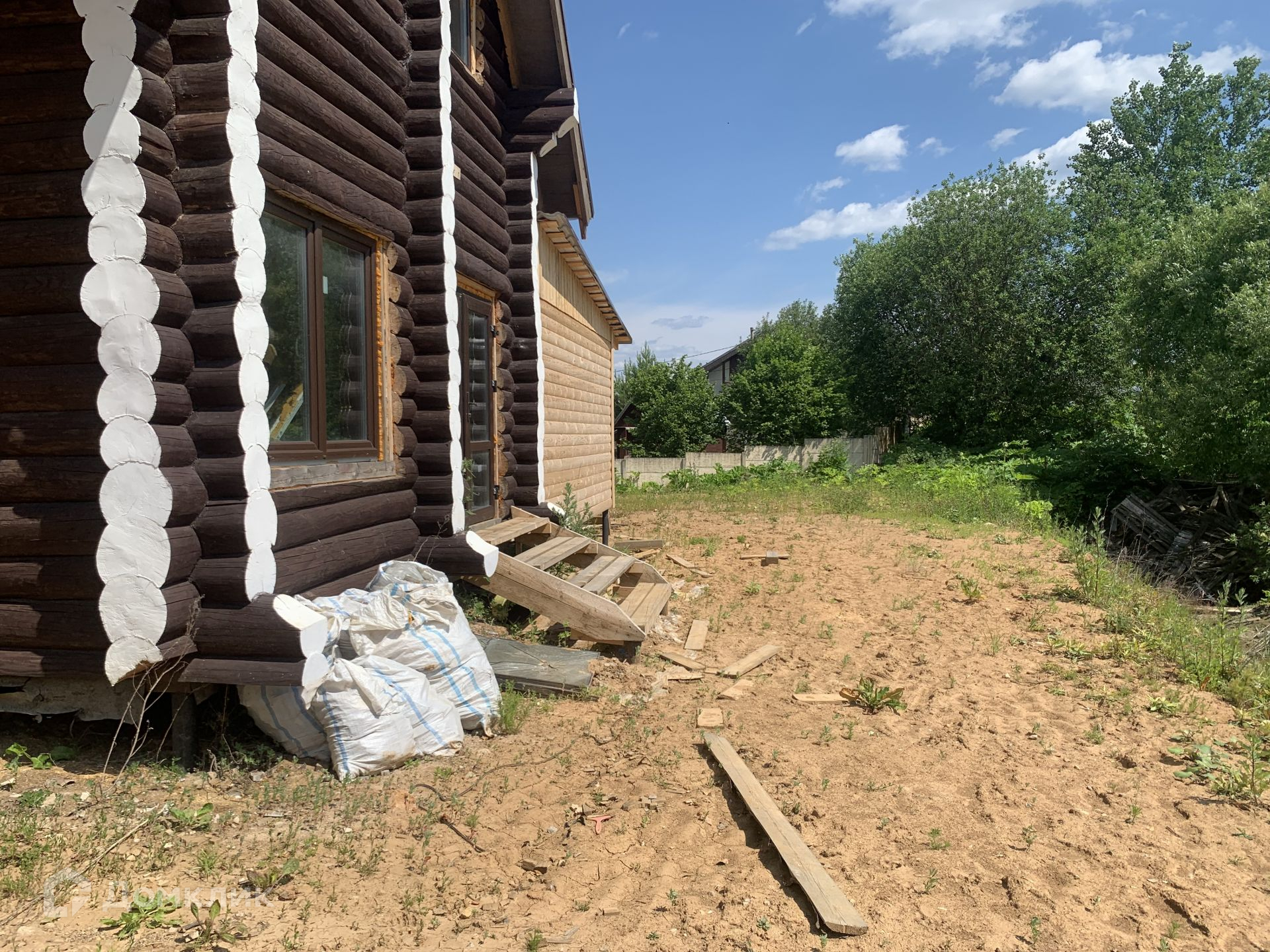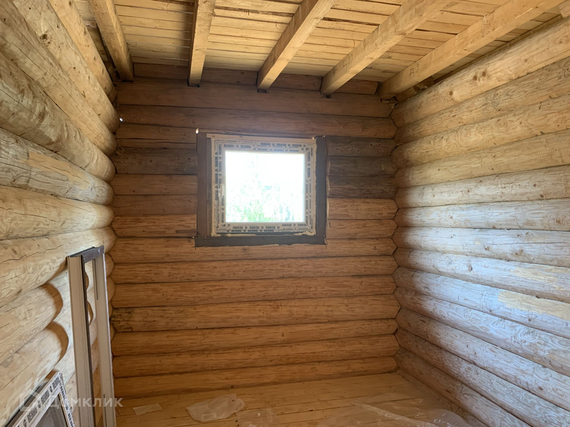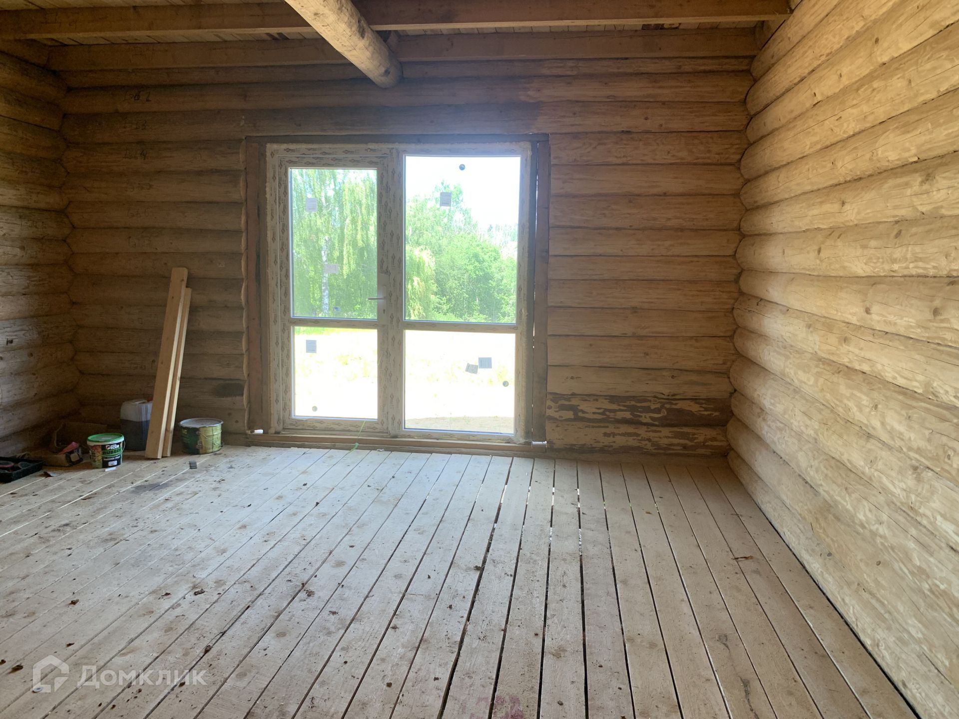 Дом выполнен из сруба, год он стоял для усадки, сруб снаружи пропитан коричневым лаком для дерева, торцы бревен в белый цвет выполнены.