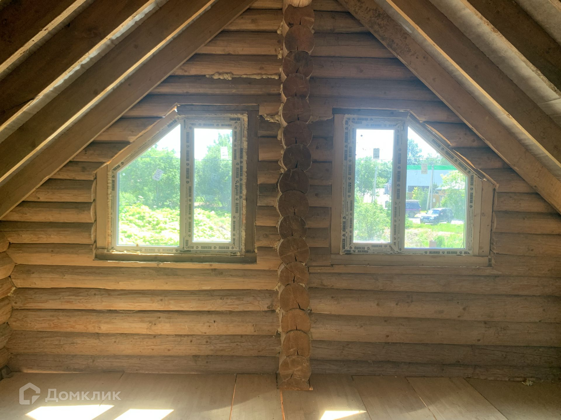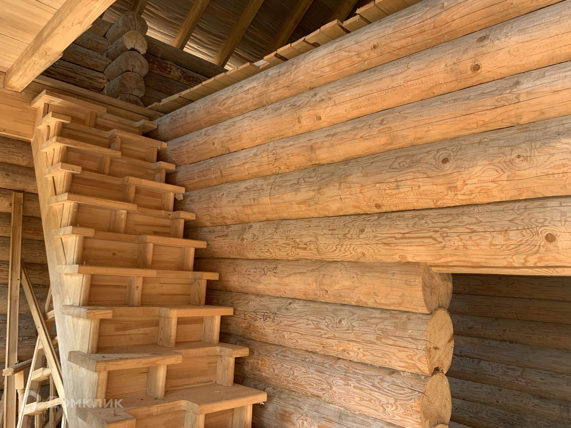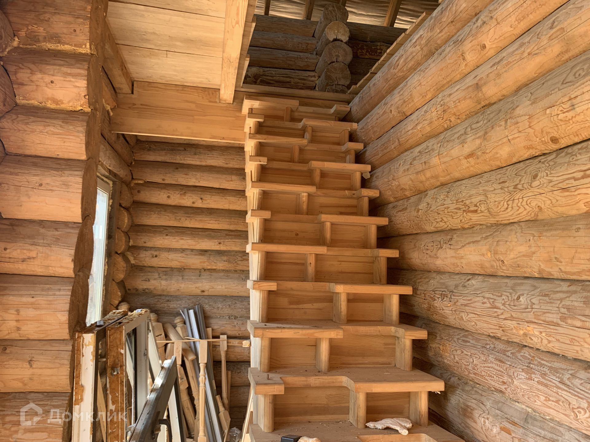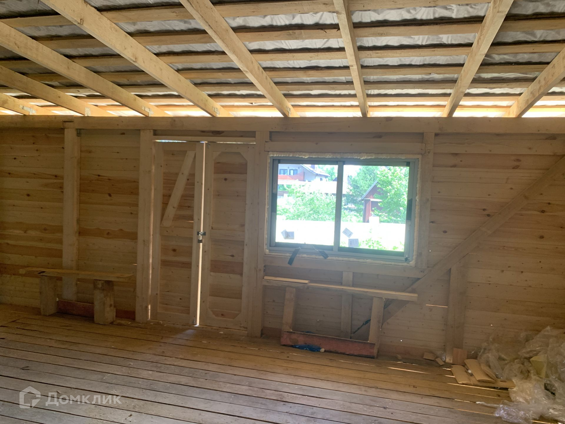 Дом выполнен из сруба, год он стоял для усадки, сруб снаружи пропитан коричневым лаком для дерева, торцы бревен в белый цвет выполнены.