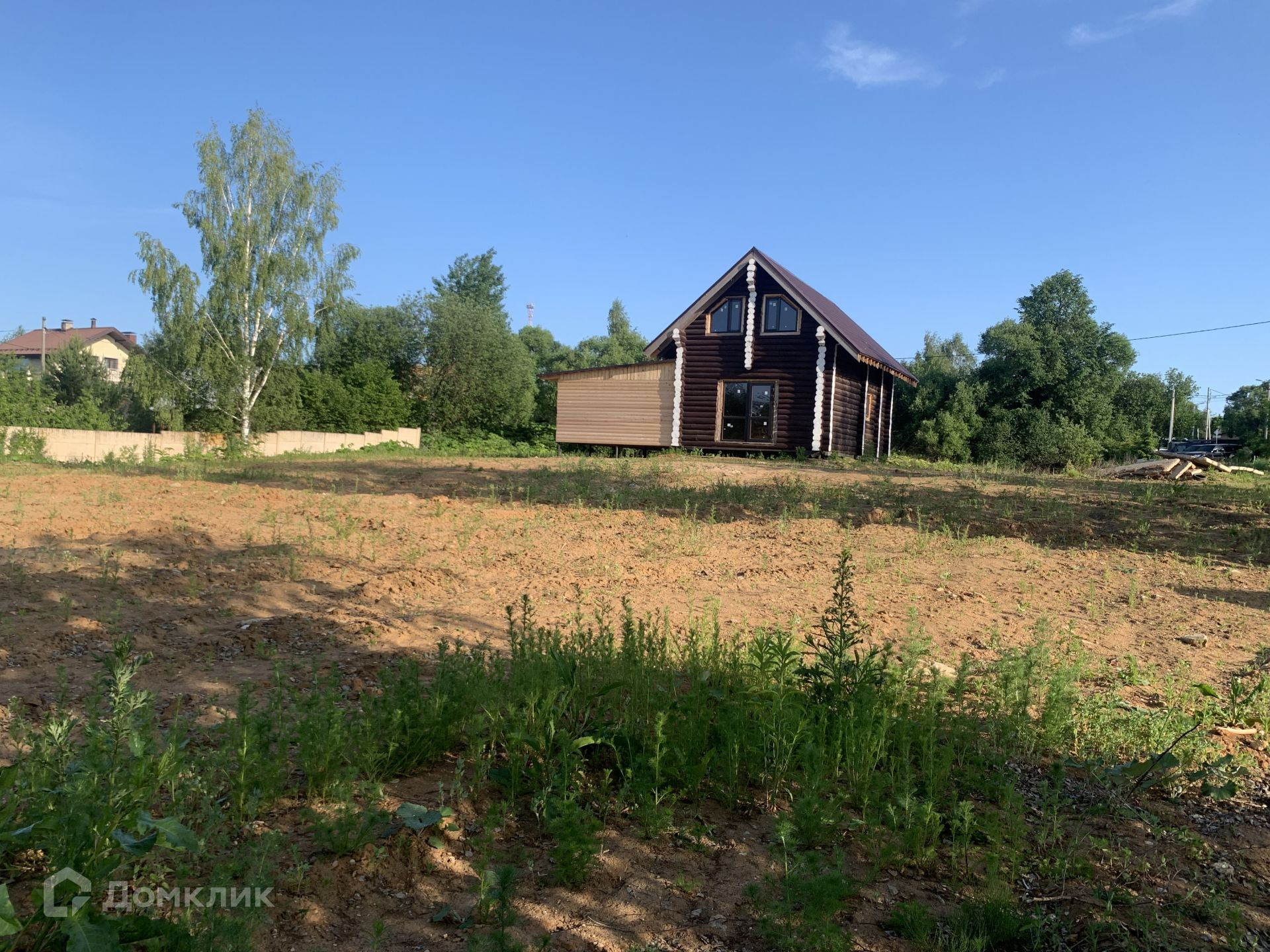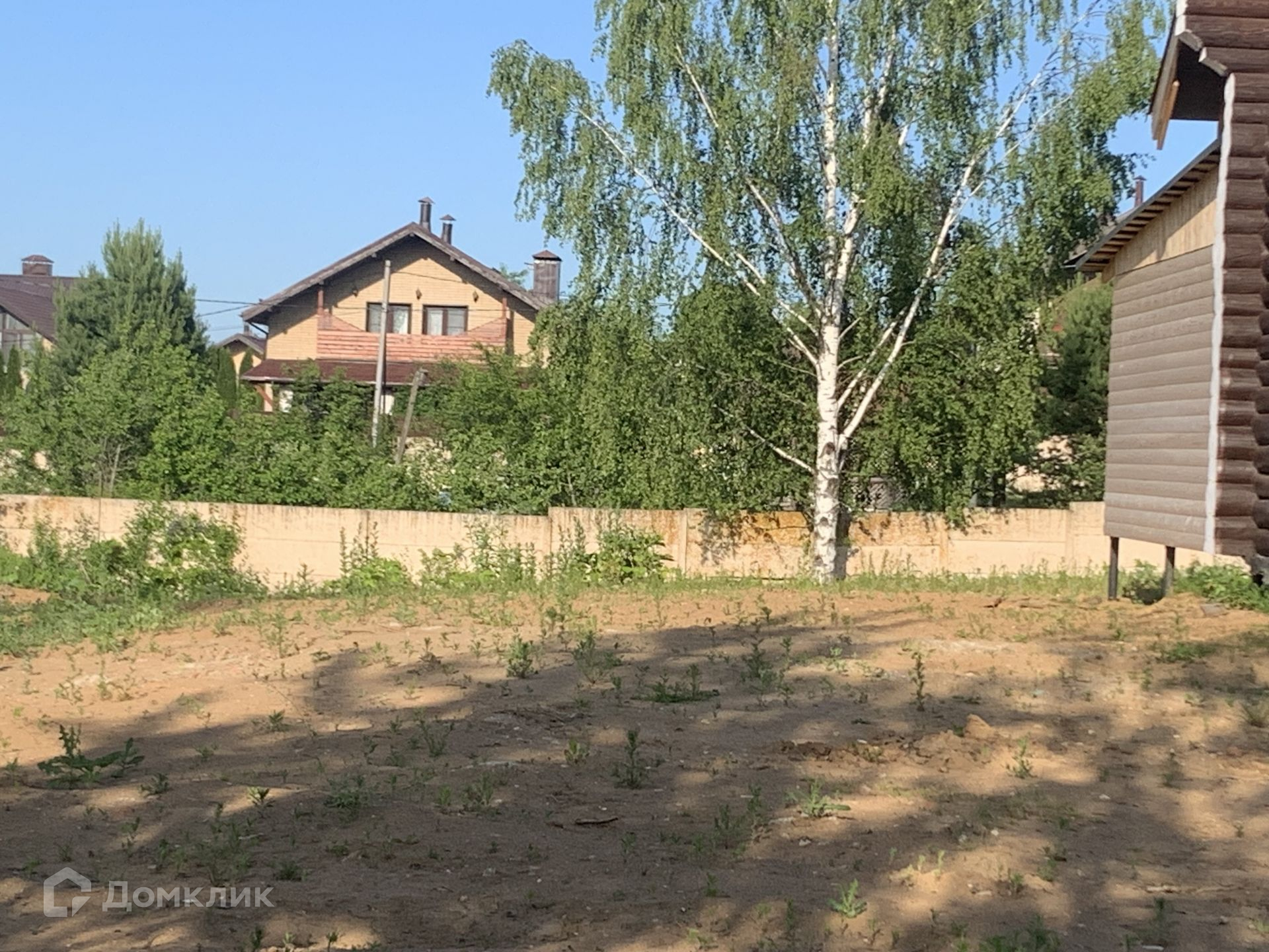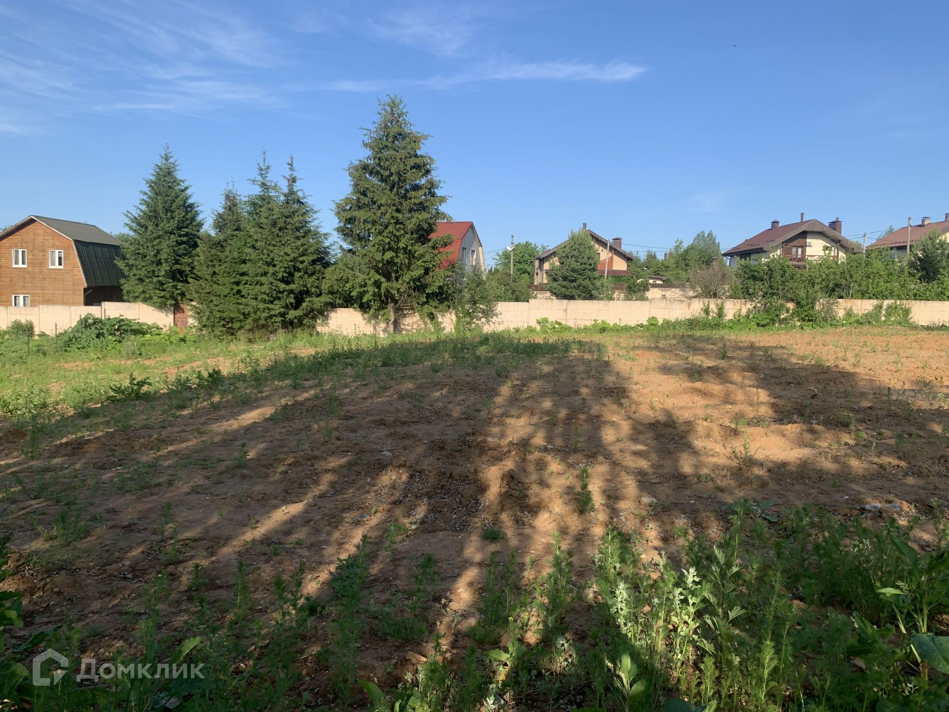 Участок 20 соток, имеет прямоугольную форму, наклонный в сторону водоема, расчищен, готов к застройке.