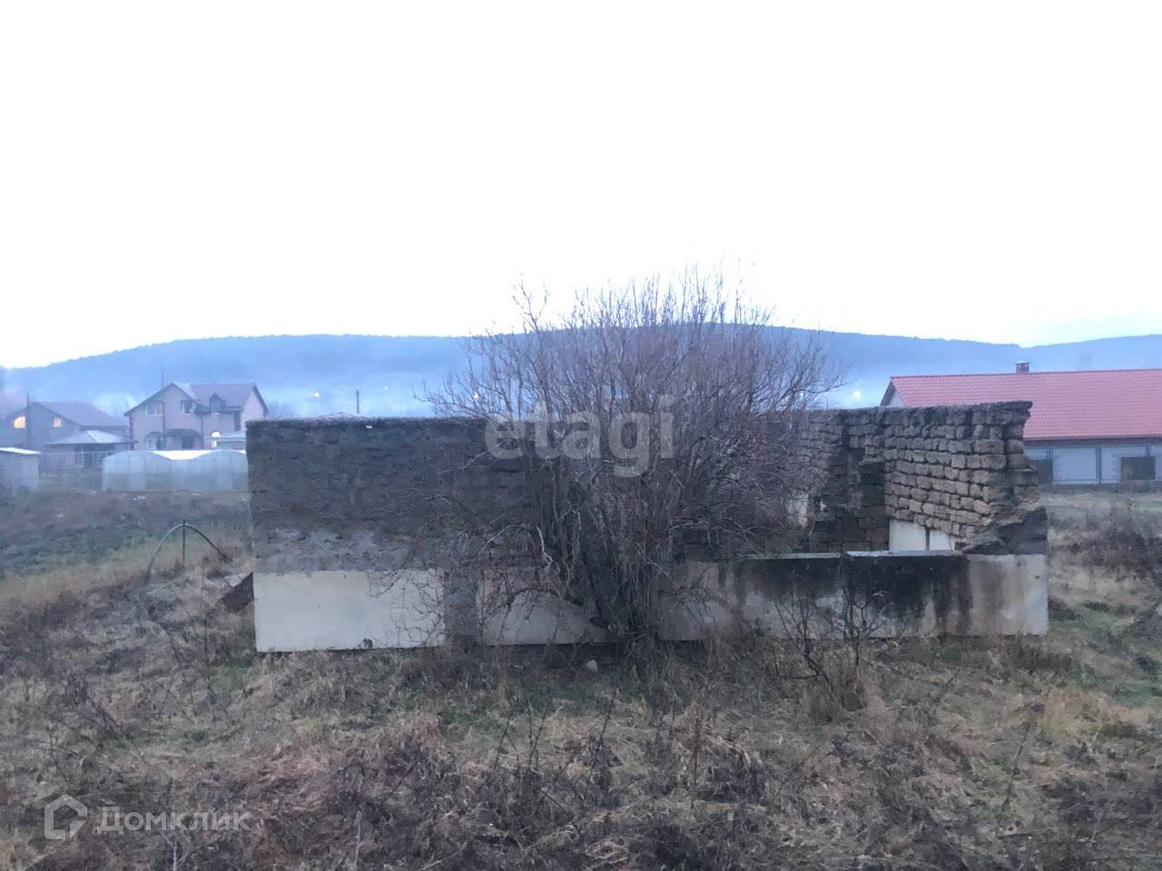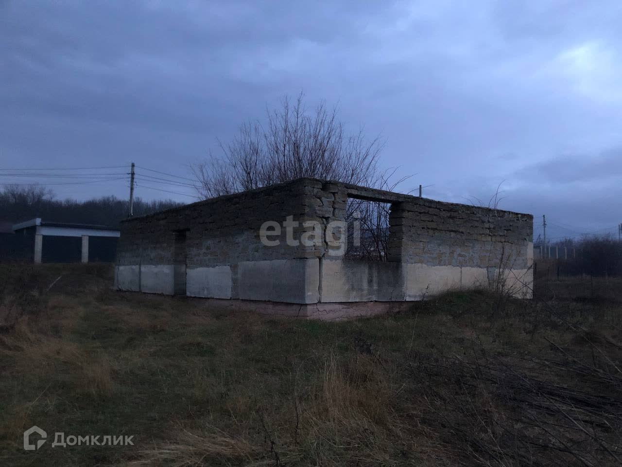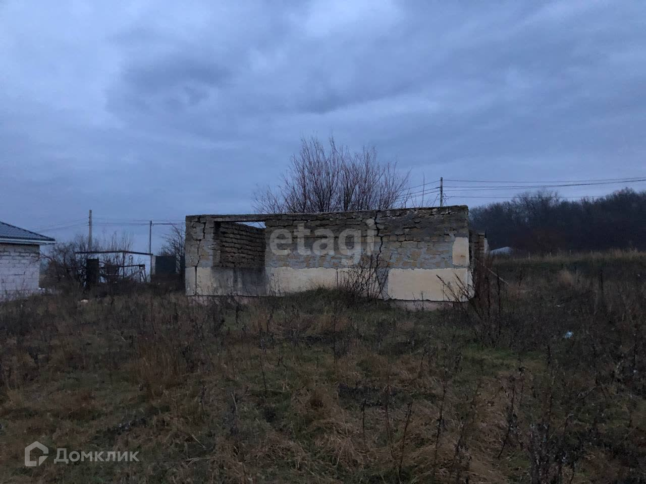 На участке находится недостроенный дом (8х10 м): стены без крыши. Есть возможность подвести все коммуникации. Электричество, газ и централизованный водопровод проходят по границе участка. Рядом жилые дома.