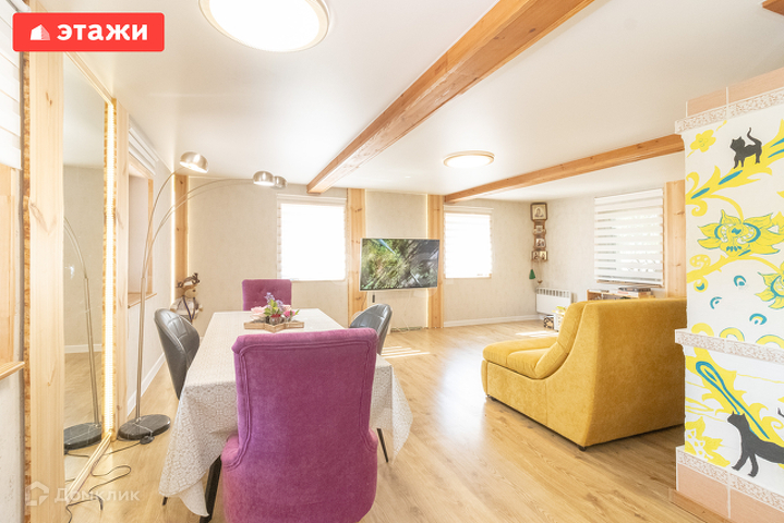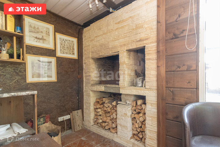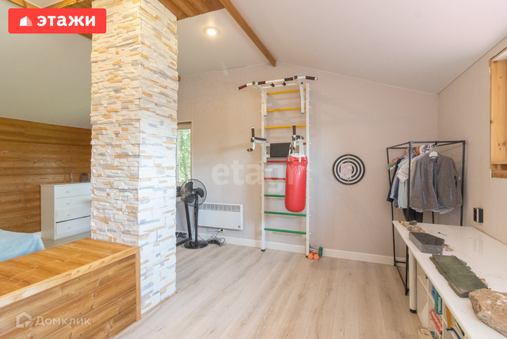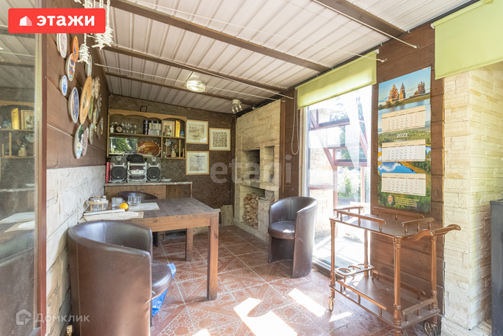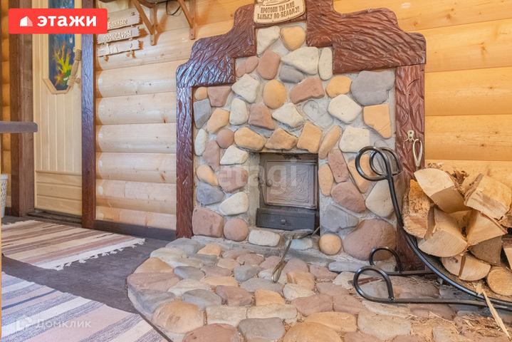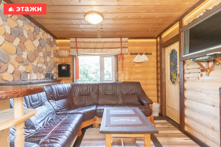 Дом на ленточном фундаменте, из бревна, пристройка газобетон, в доме есть погреб, на первом этаже теплый пол. На первом этаже расположена прихожая, кухня, гостиная, комната, санузел. На втором этаже две комнаты, с видом на зеленый двор.
