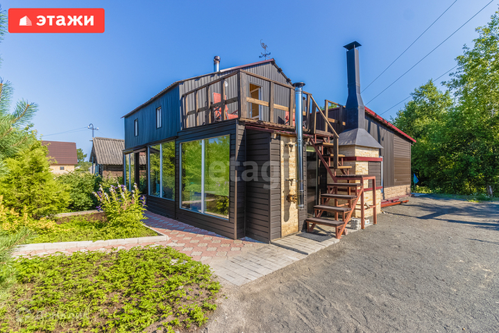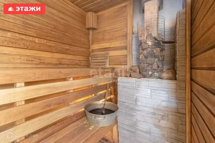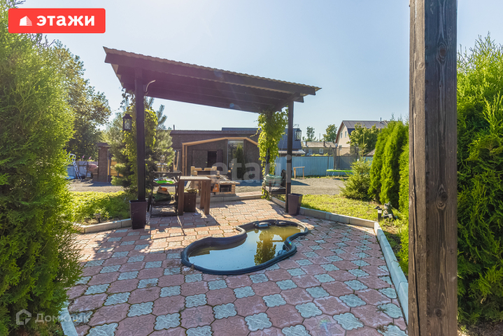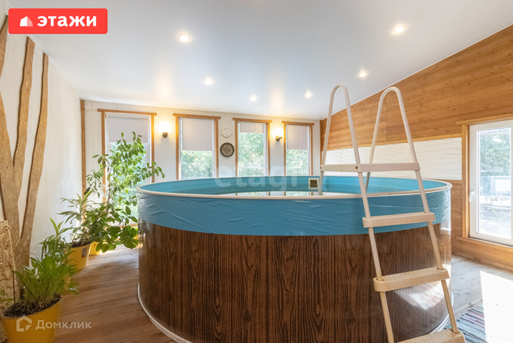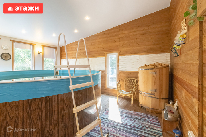 Баня 98 кв.м стоит отдельно на участке, в бане барбекю, мангал и печь, комната отдыха, душевая, круглый бассейн Azuro 4 метра в диаметре и высота 1,1 метр, кедровая бочка с генератором. В бане на втором этаже комната отдыха с мансардой.