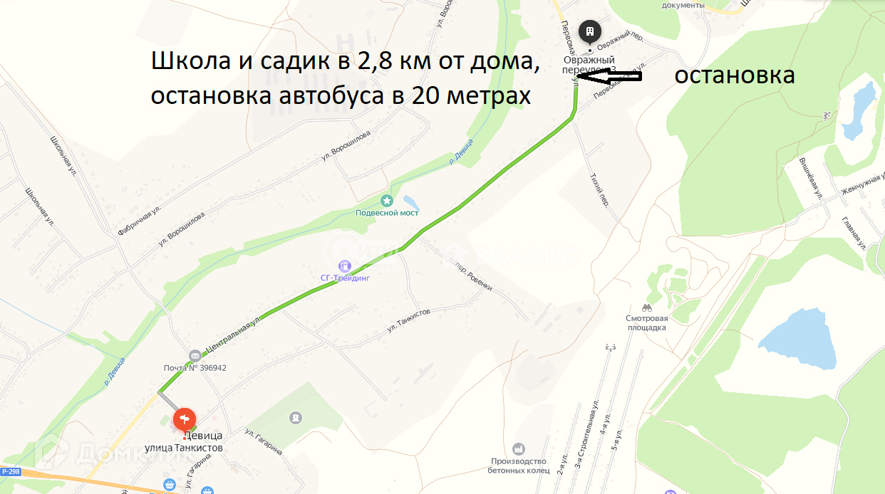 Очень хорошее и живописное месторасположение. Центральная асфальтированная улица, съезд до дома около 50м новая дорога из щебня. Остановка в 100 метрах. Школа и садик в 2,8 км от дома. Там же центр поселка, храм.