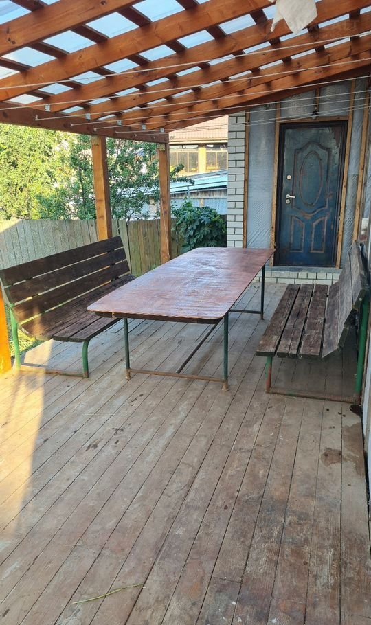 На первом этаже расположены две спальни с двумя и тремя кроватями каждая, что позволяет разместить всех гостей. Для отдыха предусмотрена терраса с деревянным столом и скамейками, где можно насладиться свежим воздухом.