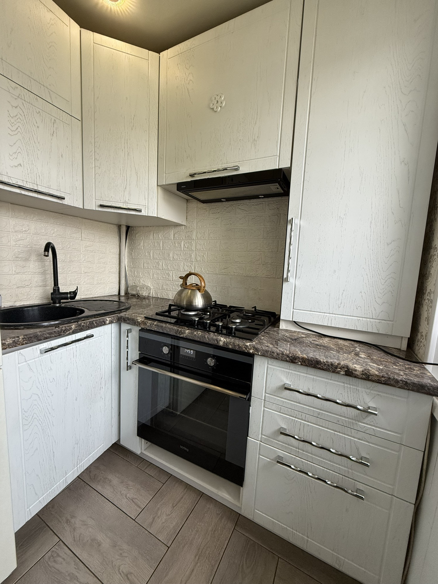 Установили новый кухонный гарнитур с дорогой брендовой техникой.