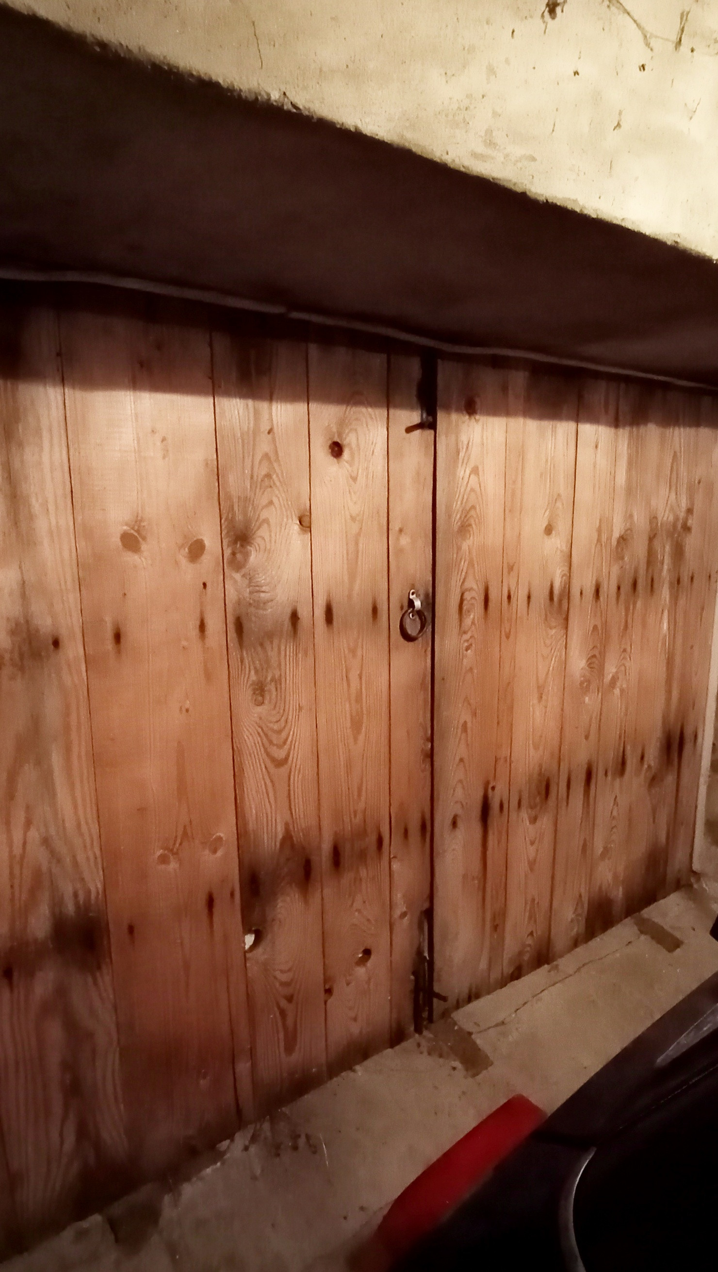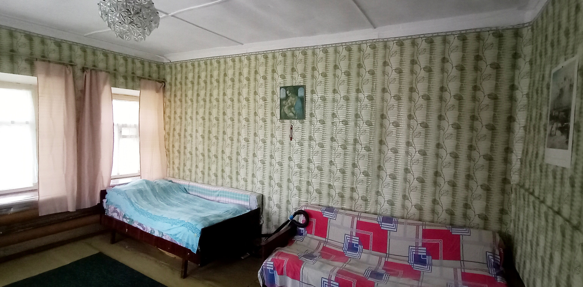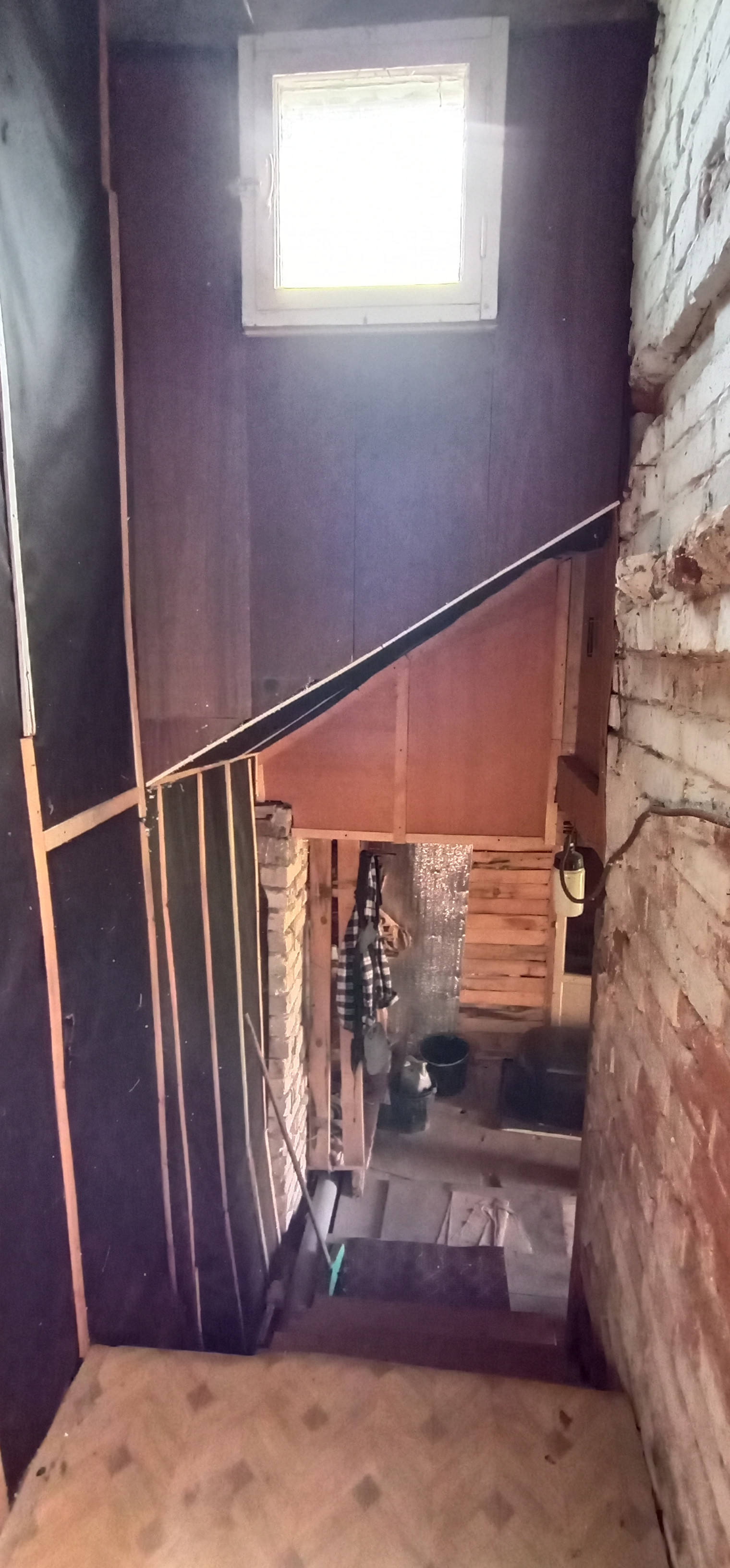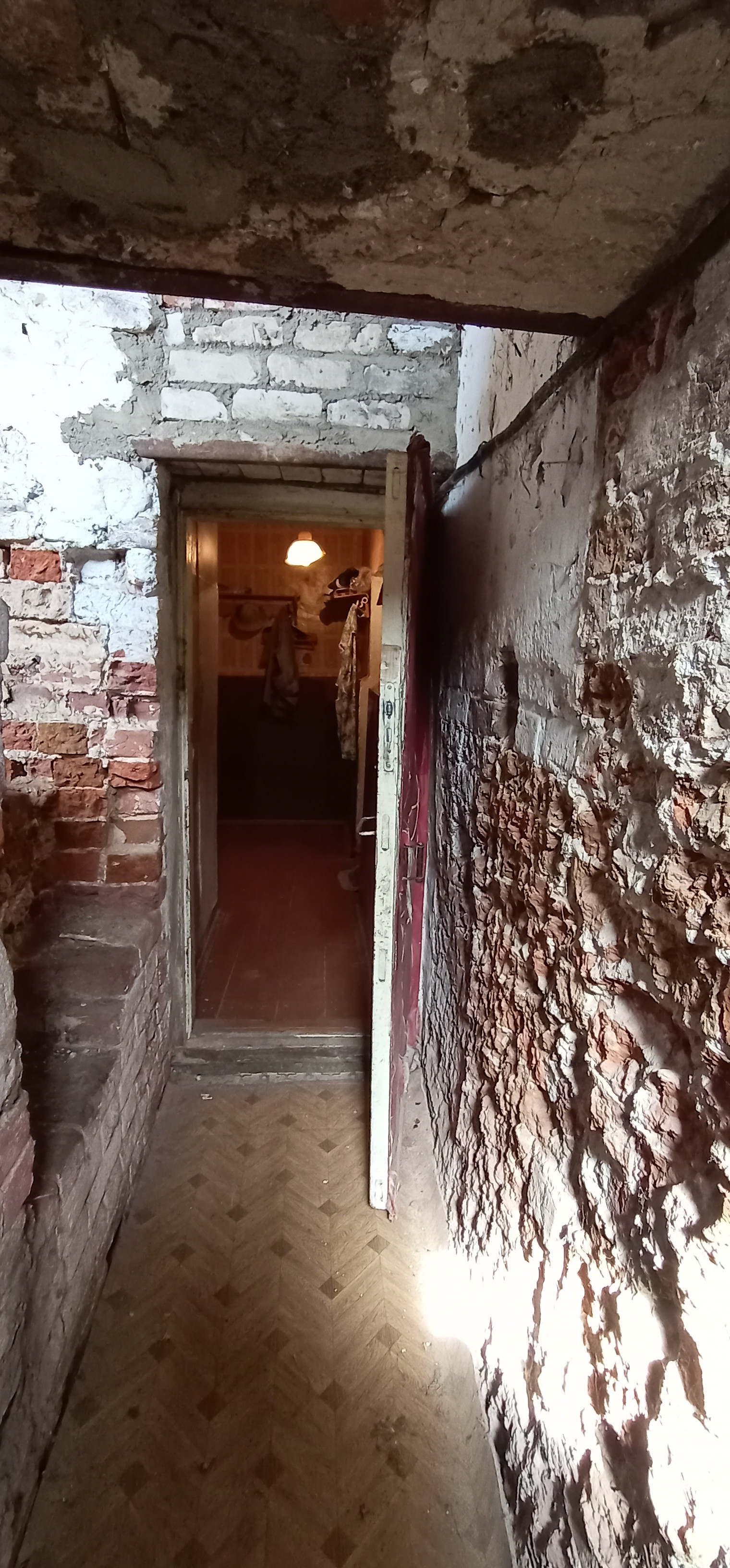 Очень толстые стены из красного кирпича, снаружи оштукатурены.
