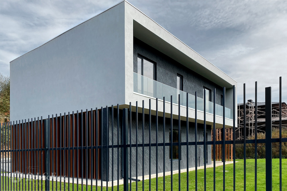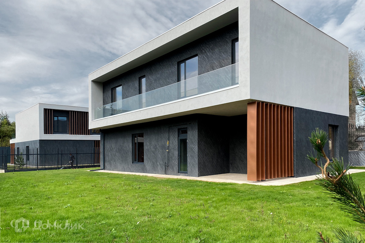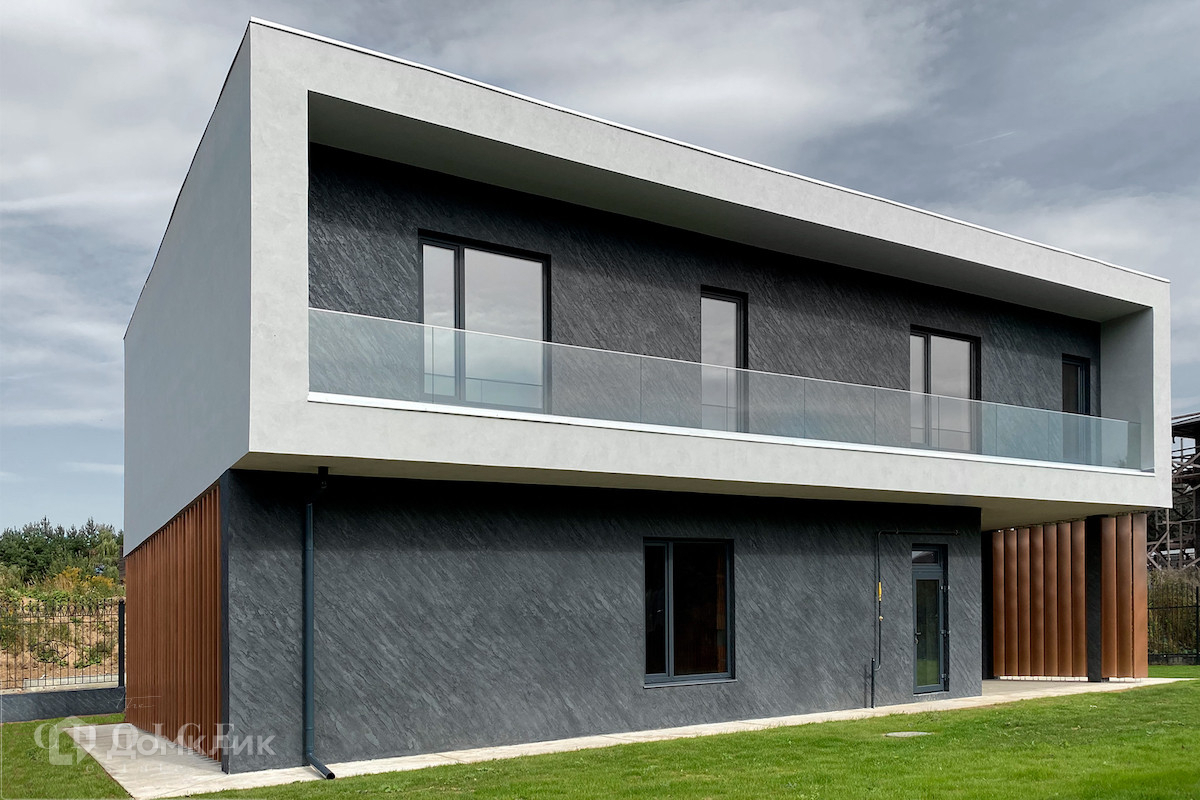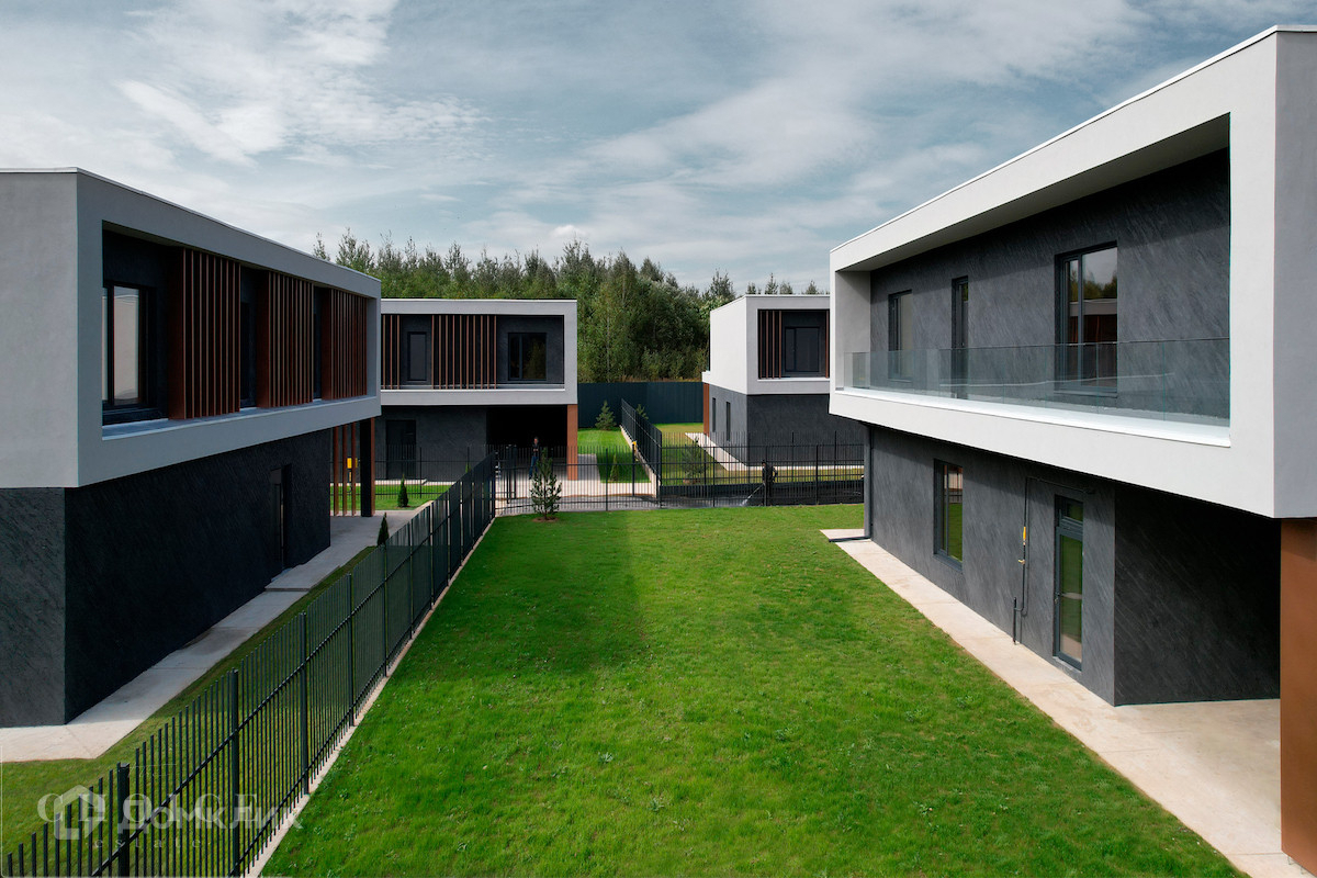 Новый загородный дом в современном стиле площадью 340 м² без отделки расположен на участке 9 соток, на отдельной охраняемой территории внутри поселка «Николина Поляна». Фасад сочетает в себе современные и природные материалы — натуральный камень, фактурную итальянскую штукатурку, медные ламели и парапетное остекление. В доме спланировано 3 спальни, мастер-блок из спальни, санузла и гардеробной, кухня-гостиная с выходом в патио, гараж на 2 машины. На эксплуатируемой кровле дома разместили террасу для отдыха. На участке с ландшафтным дизайном постелили газон, территорию огородили в едином стиле, установили ворота и калитку.