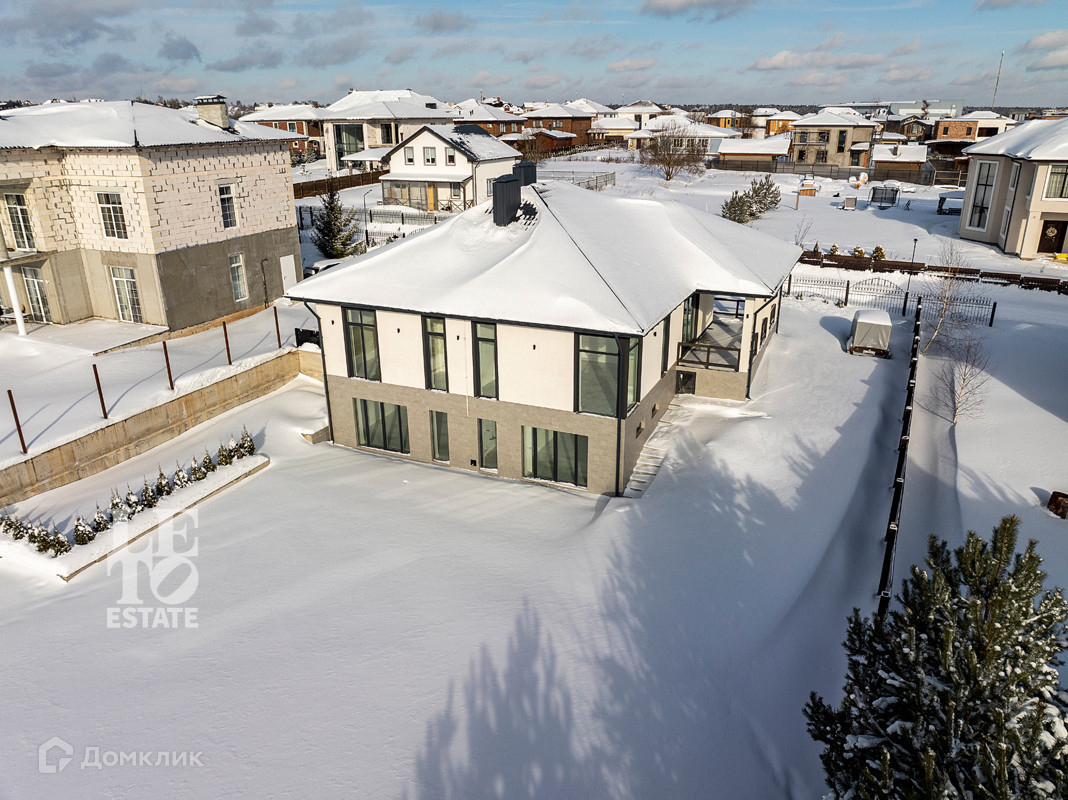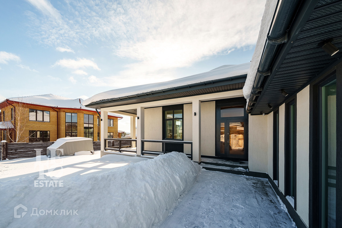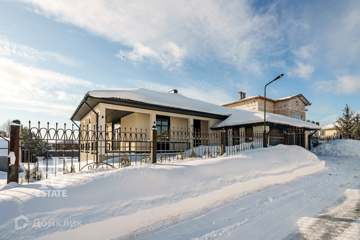 Дом построен в современном стиле из газоблока. Фасад отделан декоративной штукатуркой. Крыша сделана из металлочерепицы. Фундамент свайно-набивной. Перекрытия представляют собой монолитную бетонную плиту.