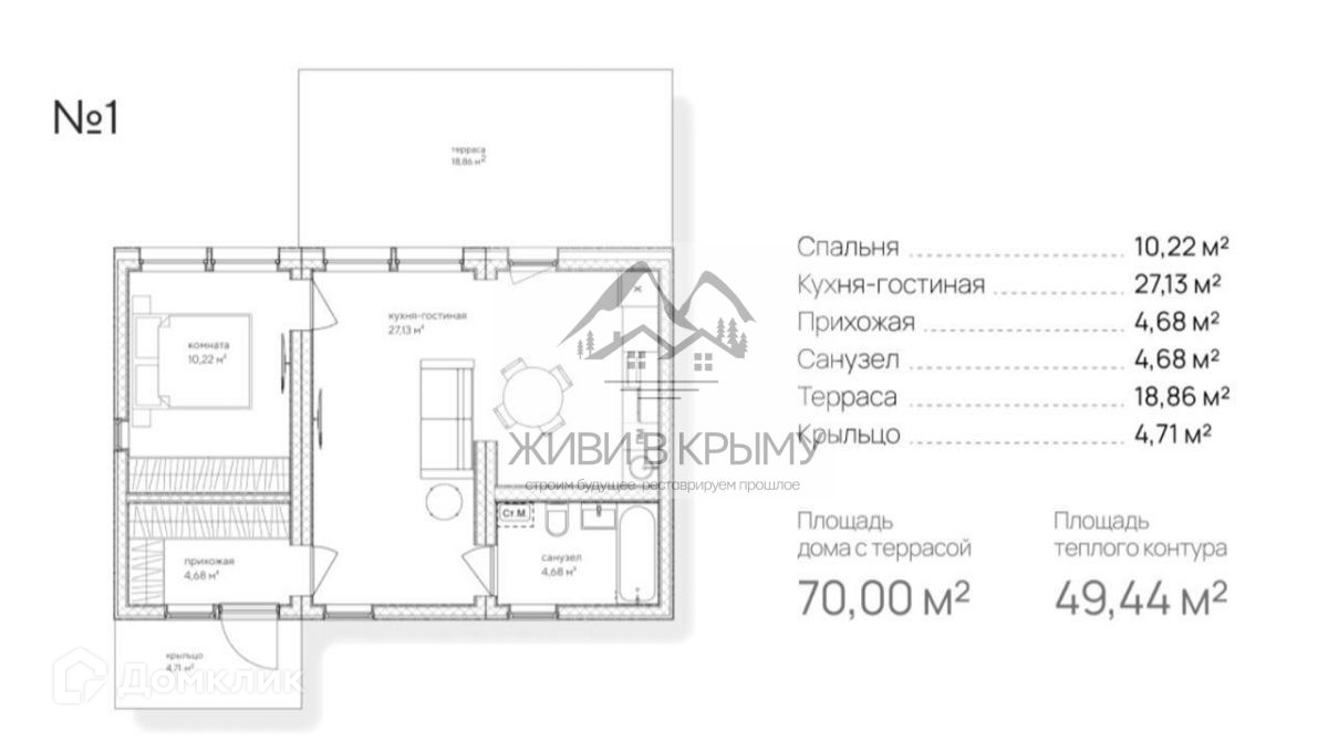Общая площадь дома 50 кв.м. плюс 20 кв.м. терраса