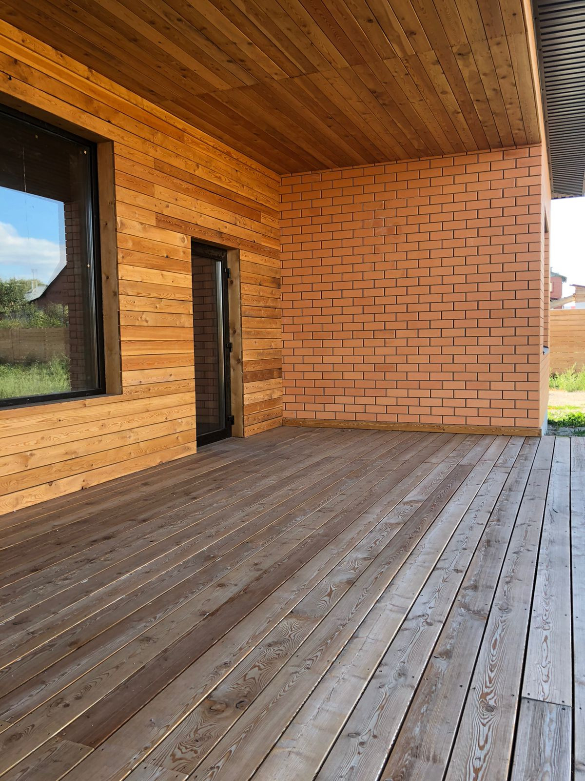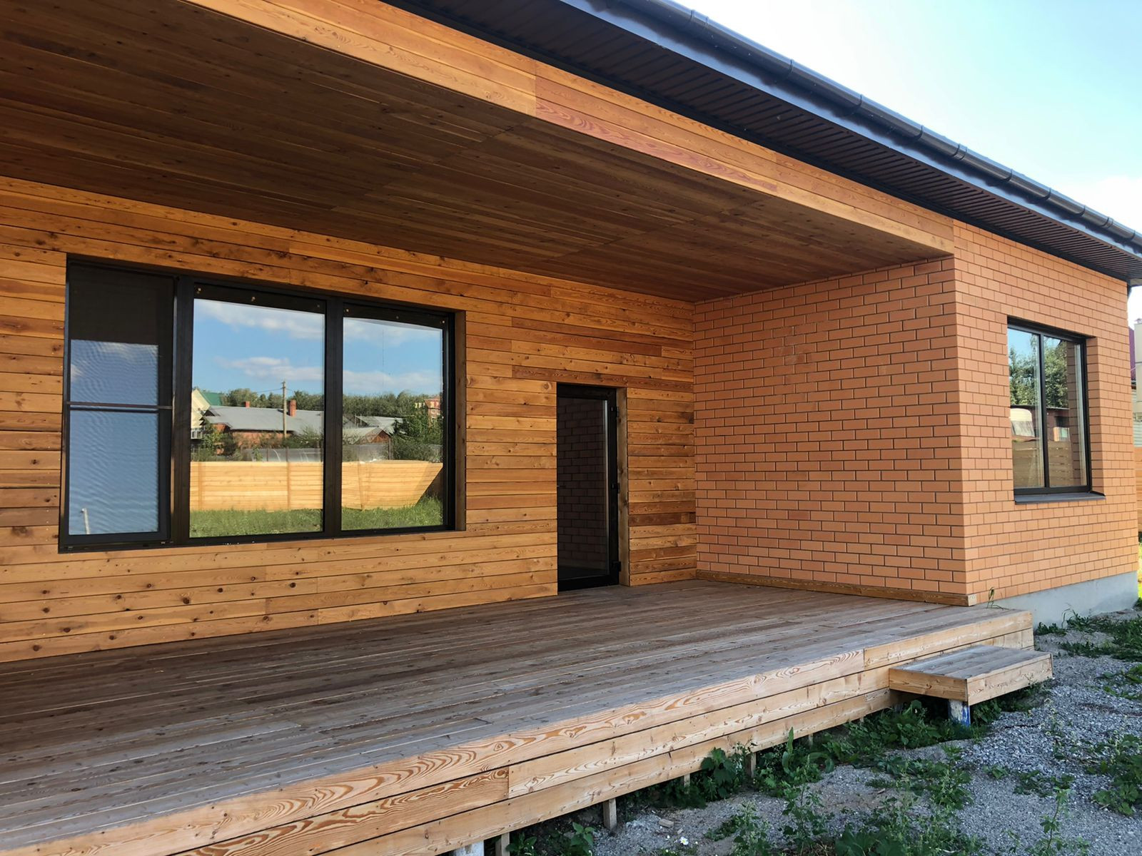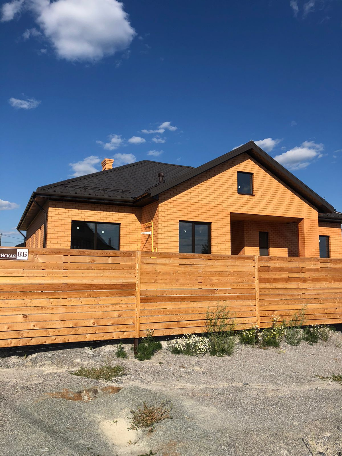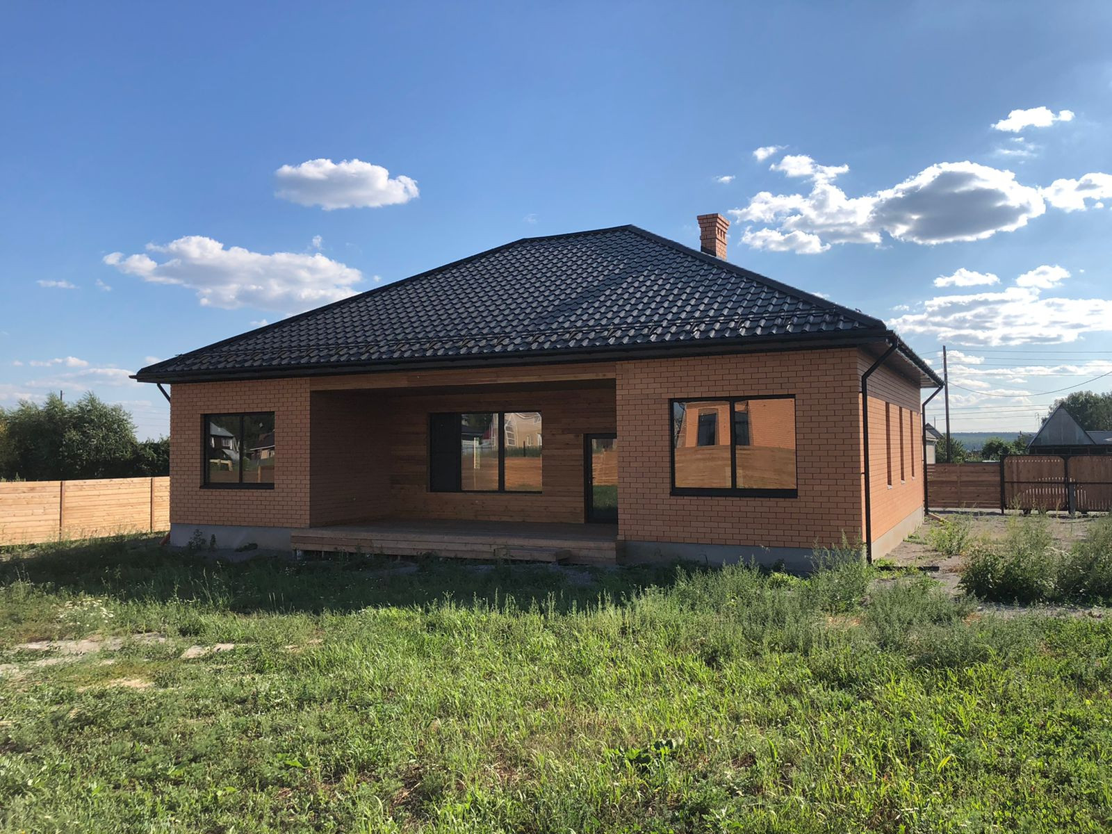 Дом современной архитектурной формы. Один этаж. Ленточный фундамент. Сложен из красного кирпича, весь фасад - облицовочный кирпич. Терасса на заднем крыльце.