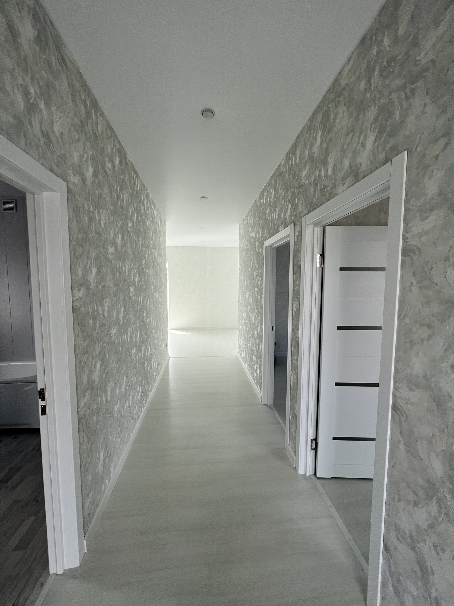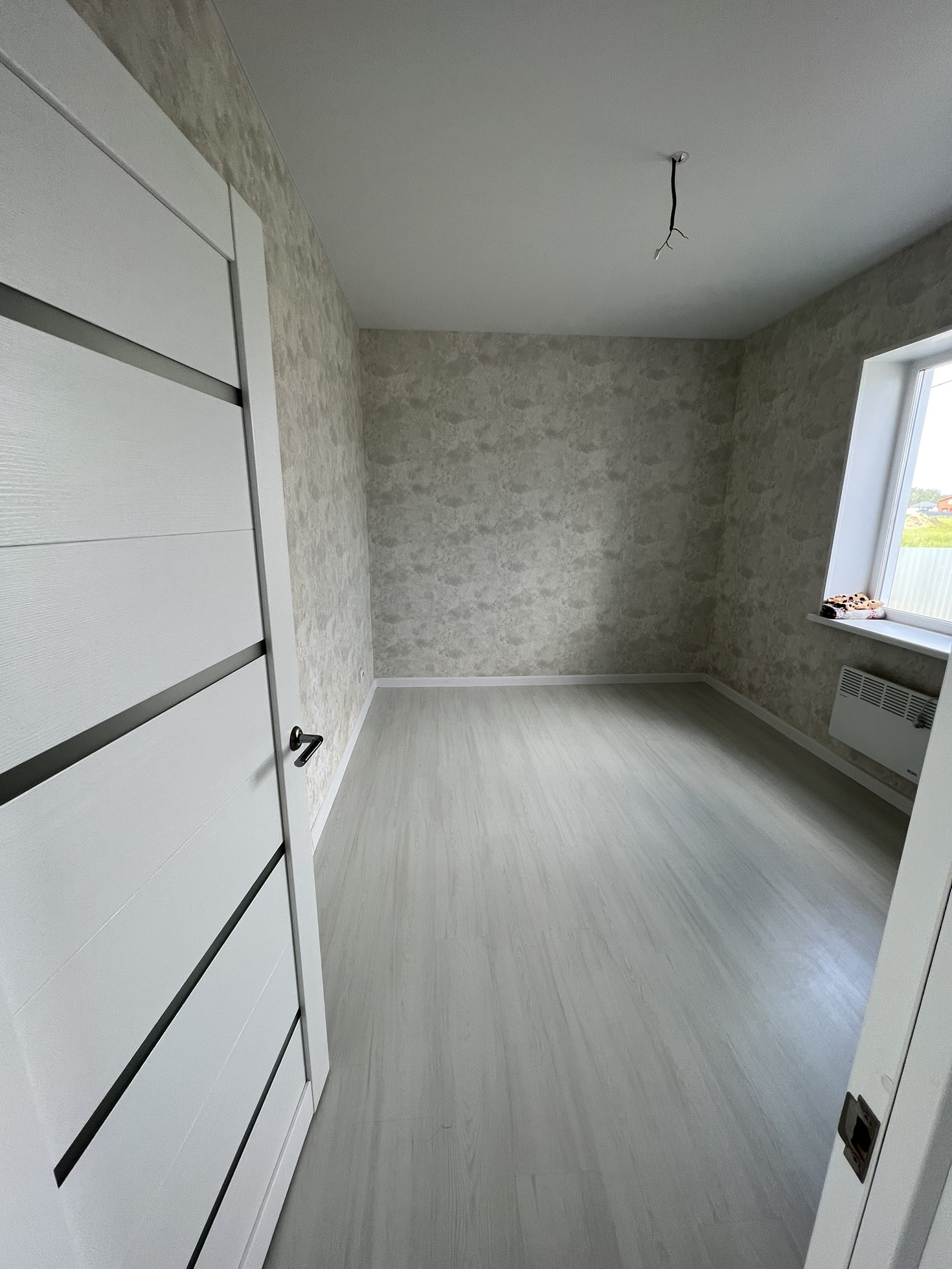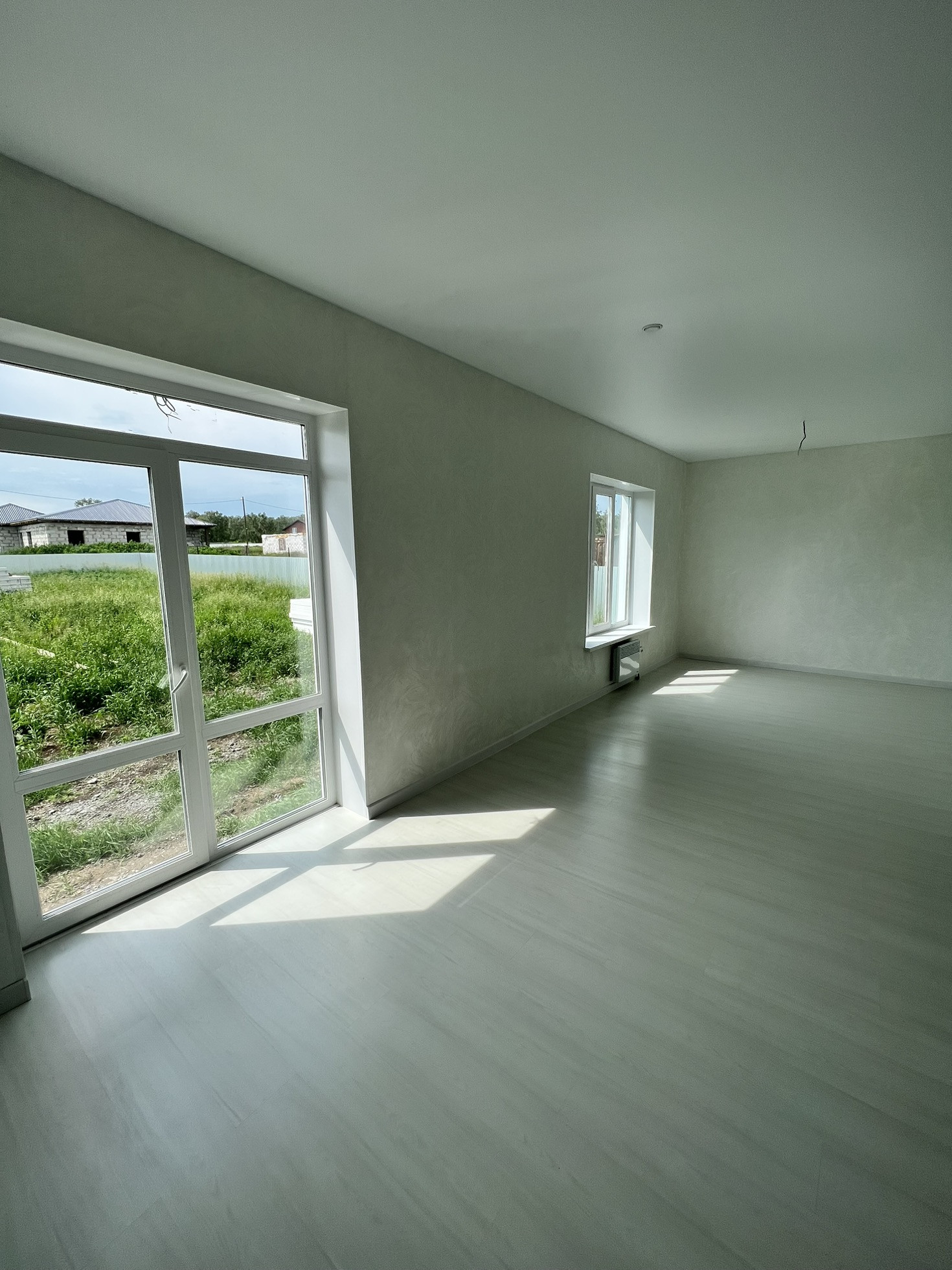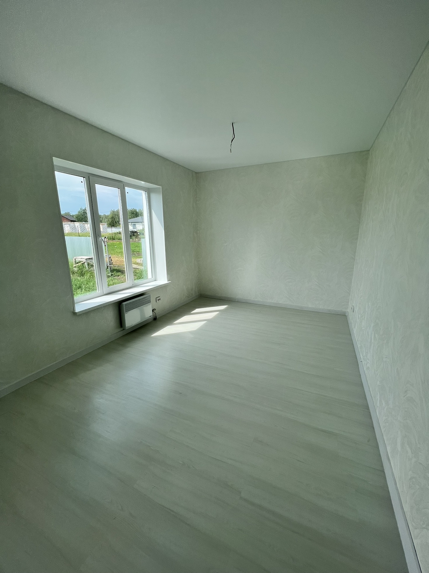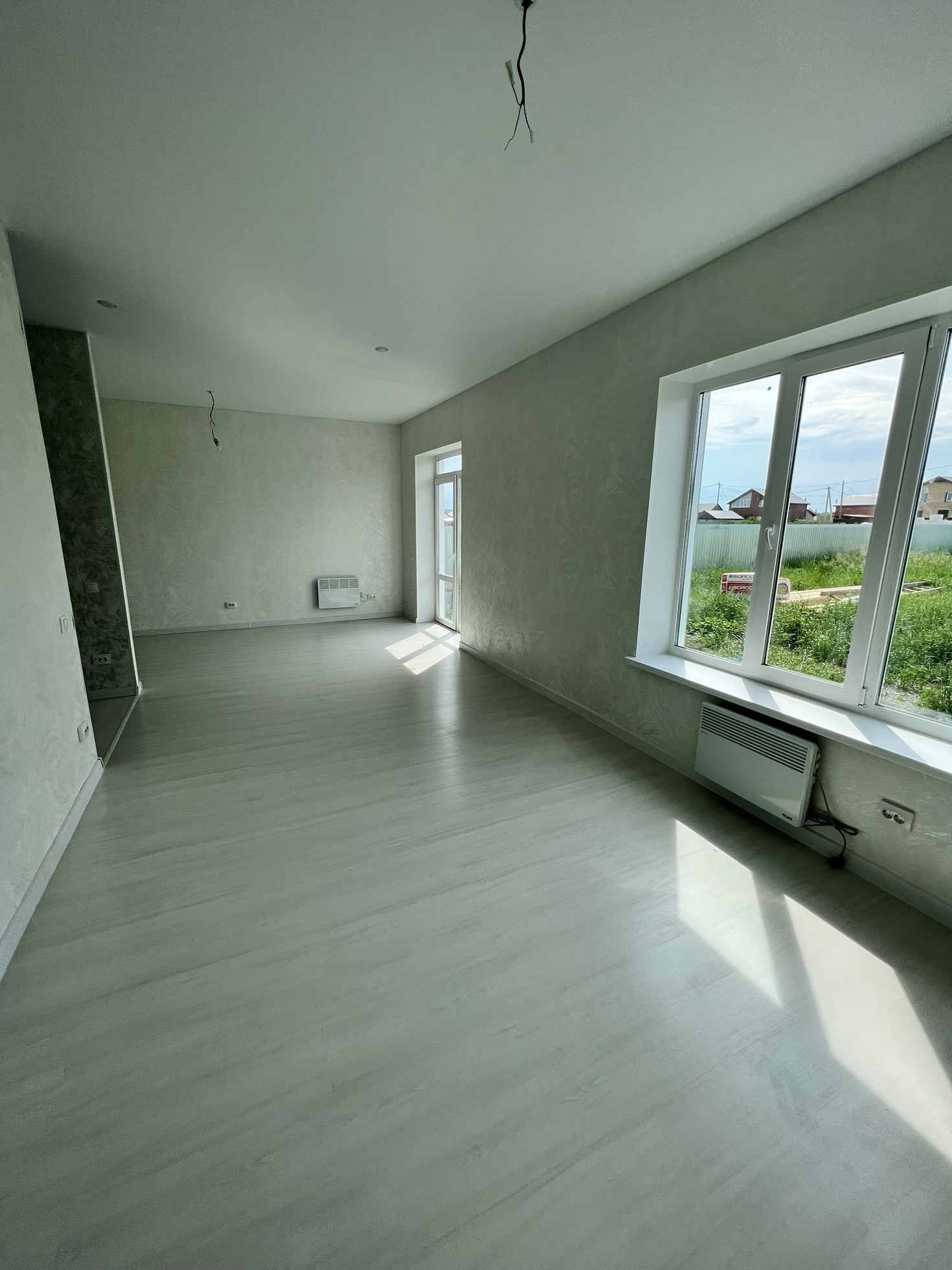 Выполнена полная чистовая отделка: качественные двери, натяжной потолок, ламинат, евроокна (трехкамерный европакет), панорамные окна в гостиной.