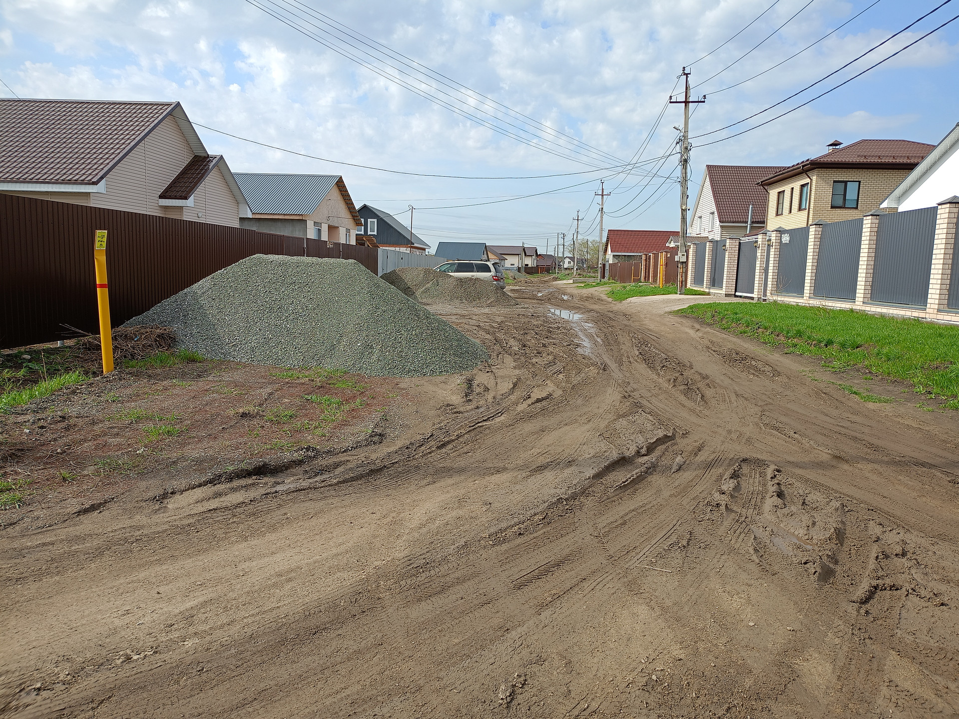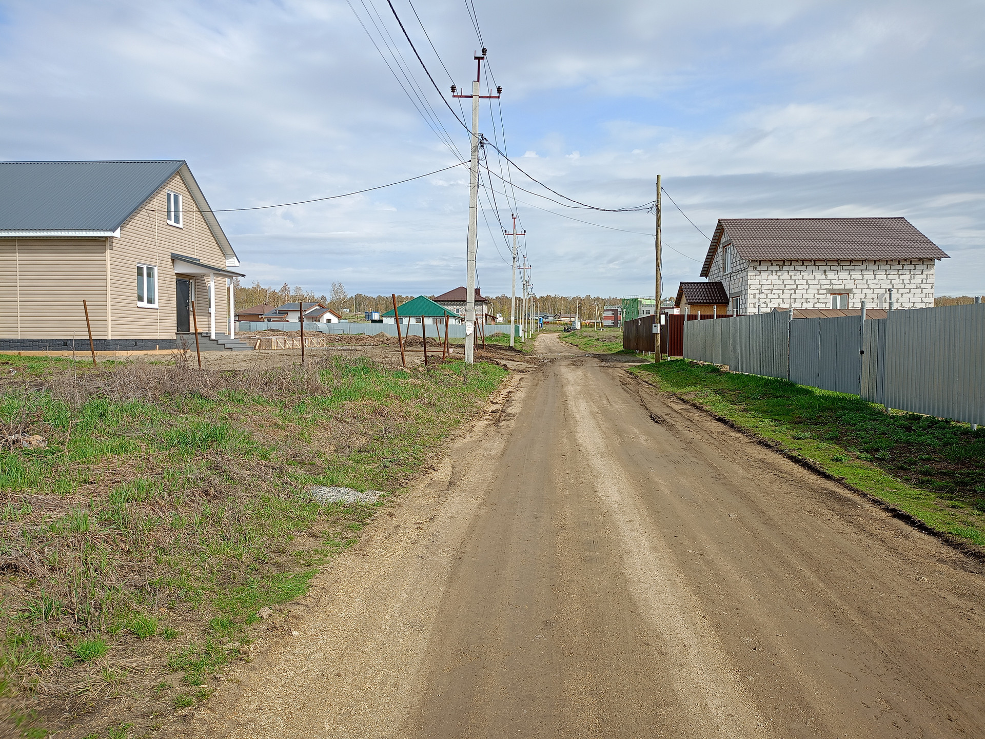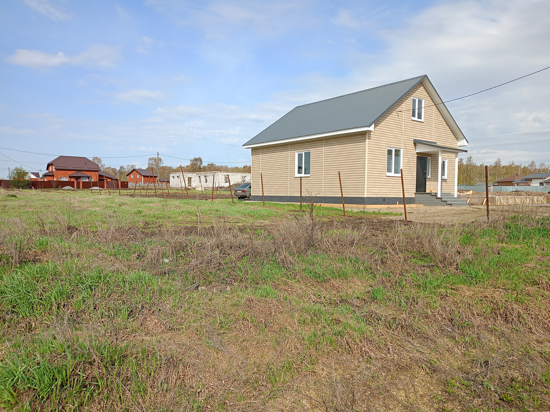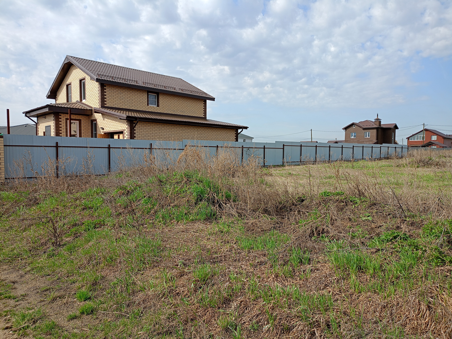 С левой стороны участка жилой дом забор из профнастила, с правой стороны жилой дом заливают столбы под забор.