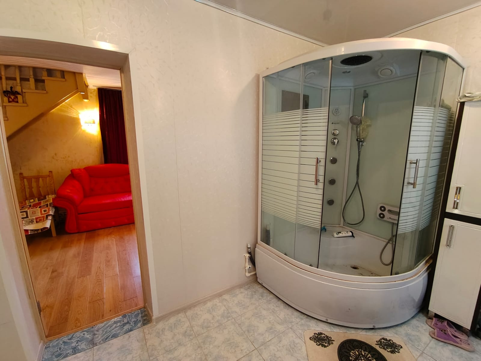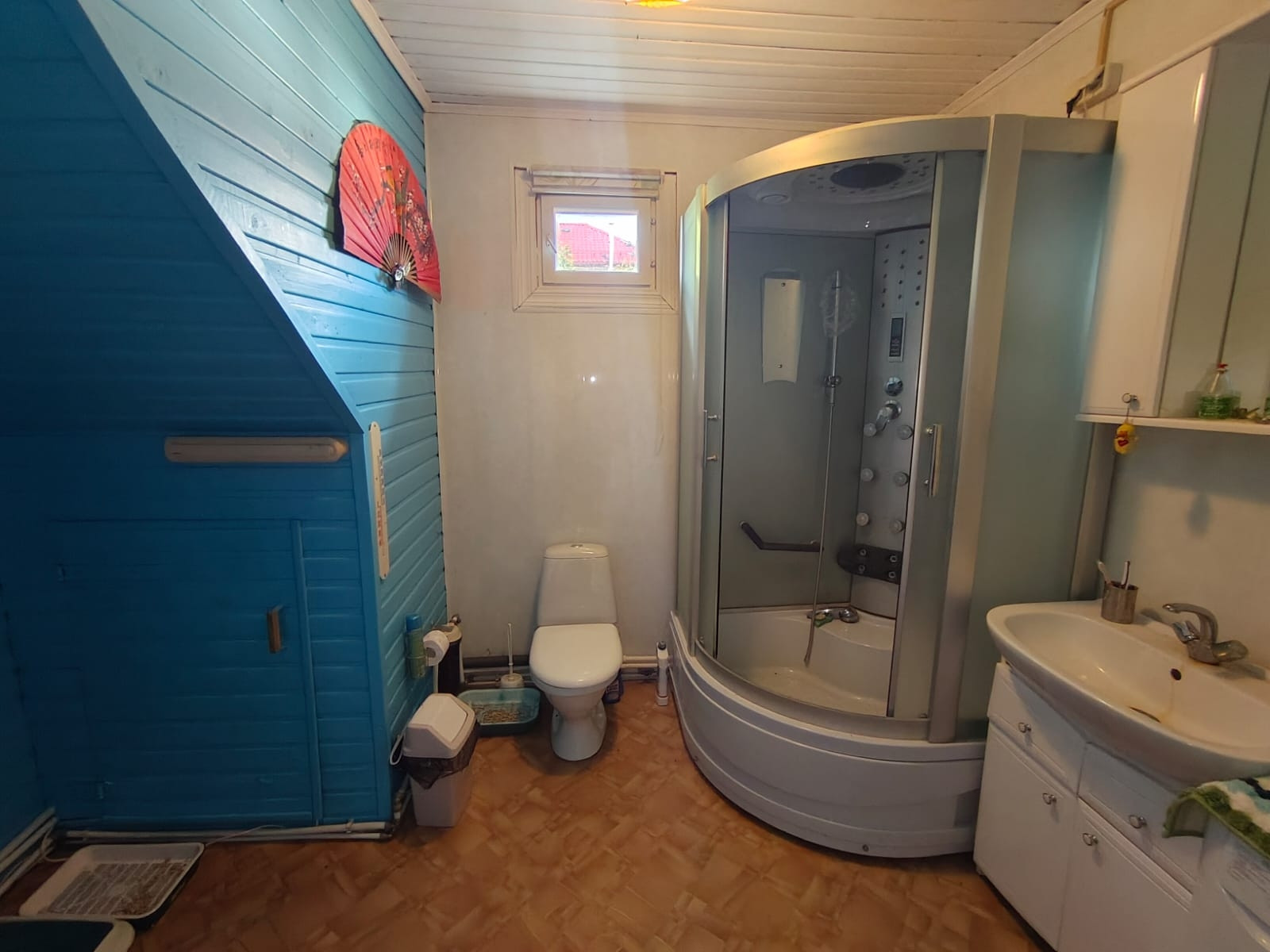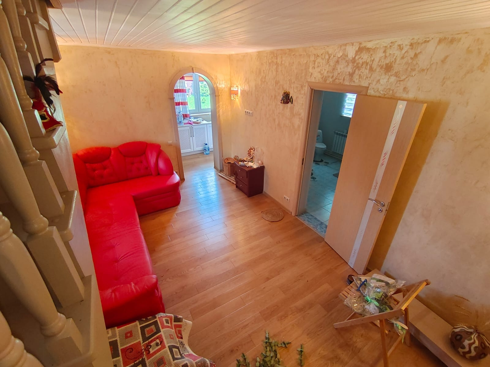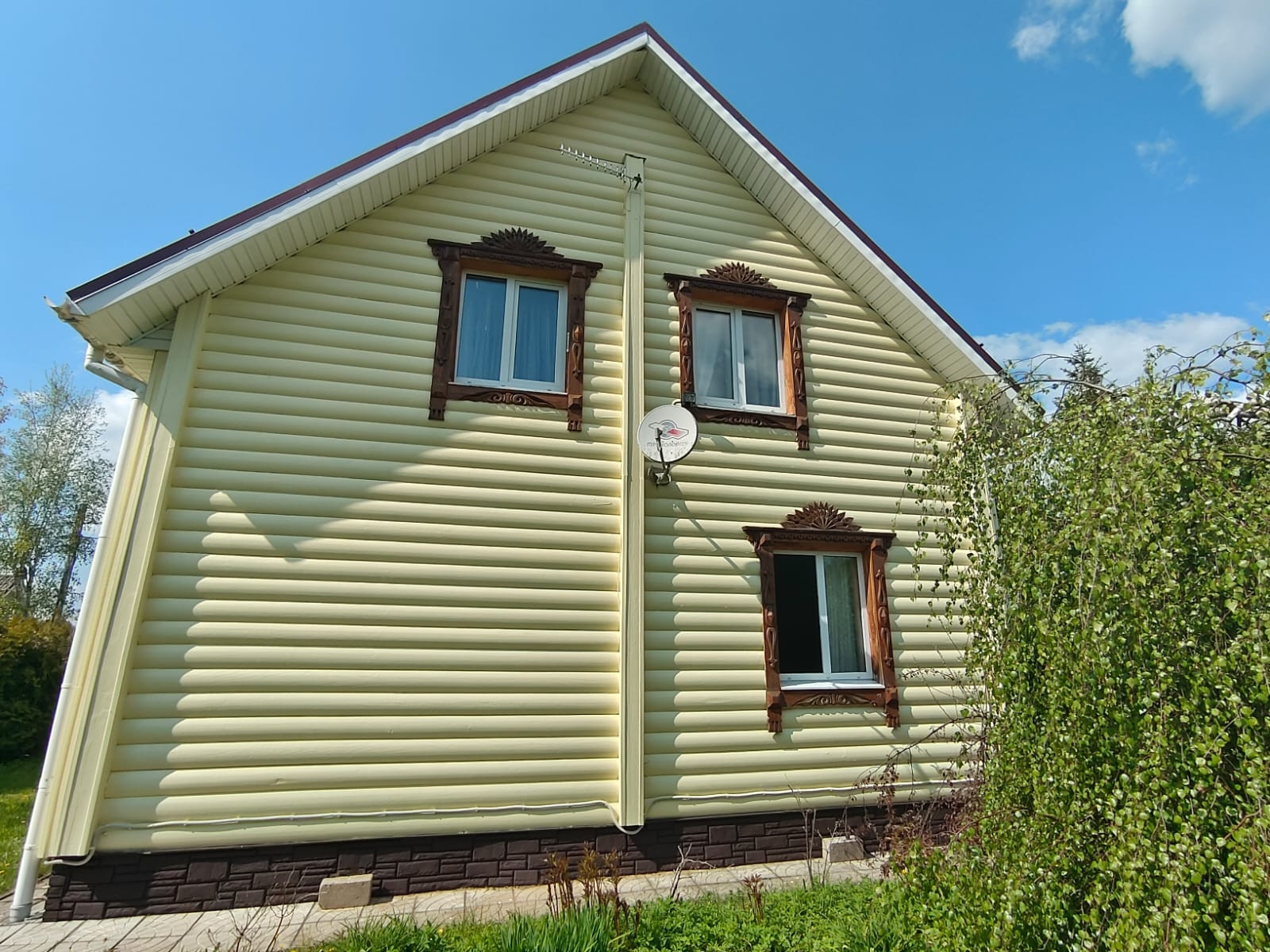Дом из бруса, 124 кв. м, в доме 4 спальни, кухня 19 кв. м, санузел на 1-м этаже 6,9 кв. м. Дом полностью с ремонтом, внутри обшит имитацией бруса, снаружи обшит блокхаусом, кровля - металлочерепица.