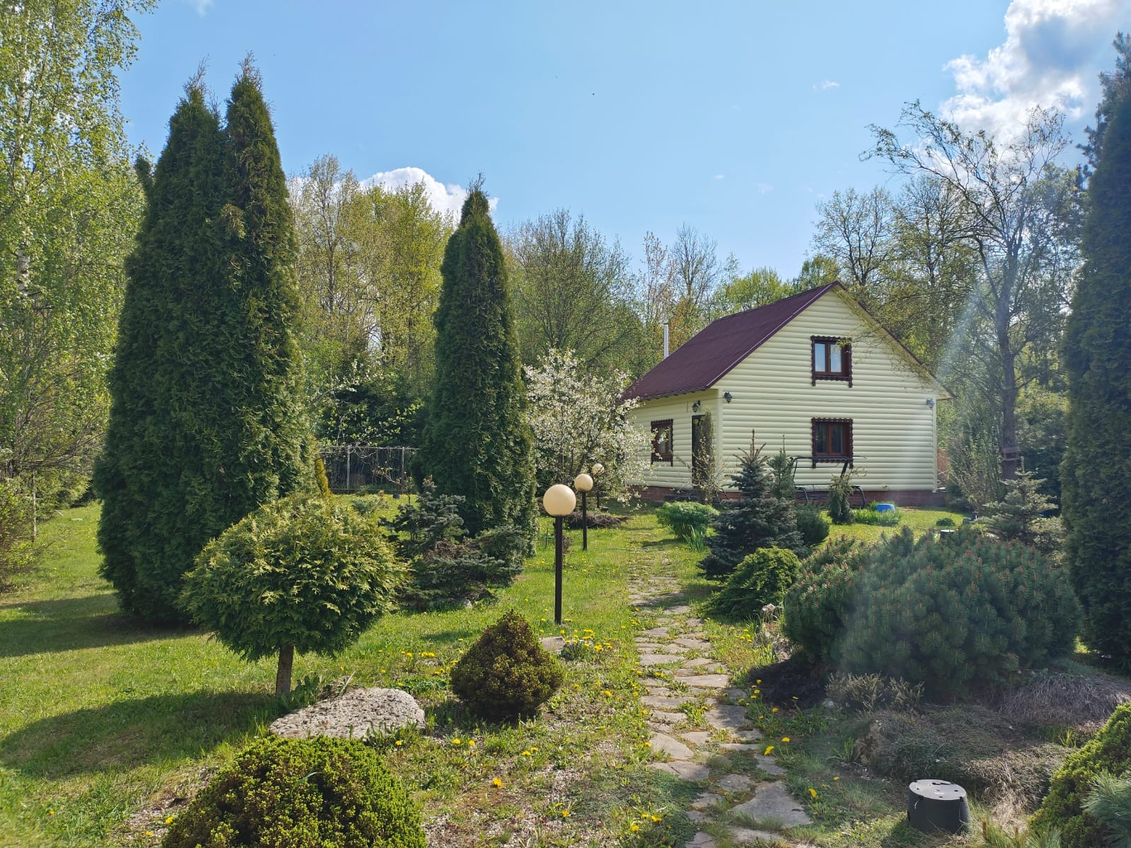 На участке полностью сделан ландшафтный дизайн, имеются различные декоративные кустарники и деревья, посажен газон, сделана система полива, есть декоративный пруд с водопадом, место для отдыха, мангальная зона, все дорожки выложены натуральным камнем, заезд для автомобиля сделан из тротуарной плитки, установлено видеонаблюдение.