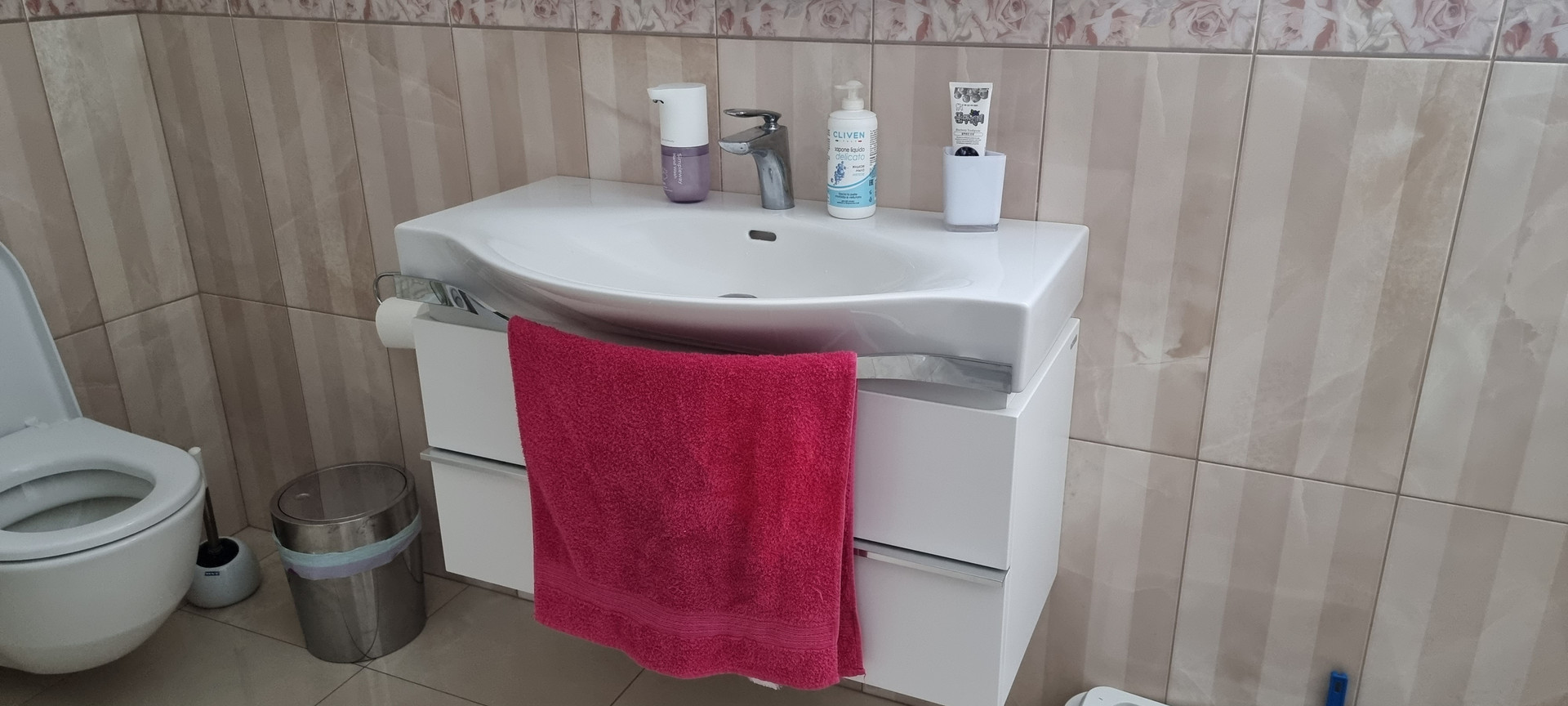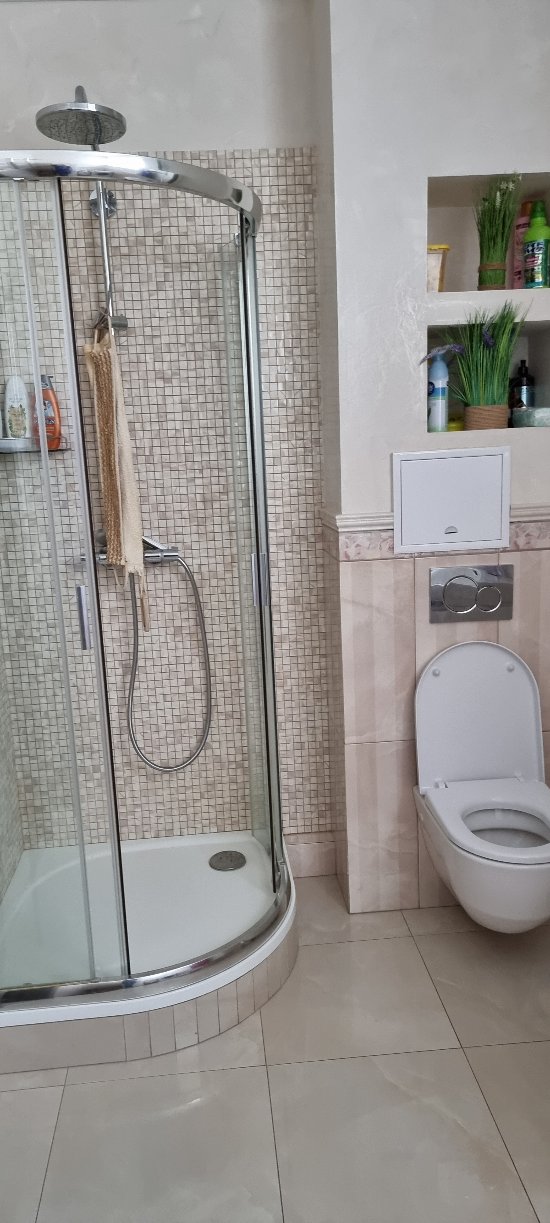 - Подвесной унитаз , раковина с тумбой,  душевая кабина