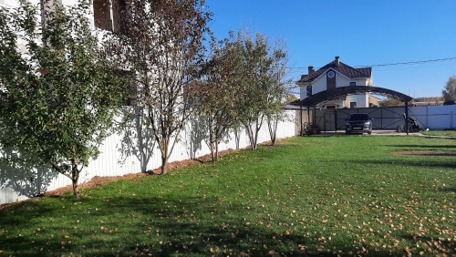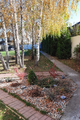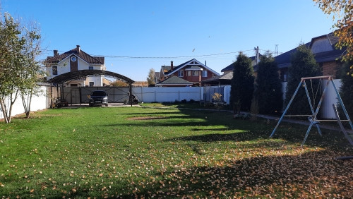 Участок ровный, правильной формы, ухожен, огорожен забором, установлены электроворота. Посажены хвойные и плодовые деревья, а также шикарные березы. Дорожки вымощены плиткой, имеется стоянка с навесом под 3 автомобиля.
