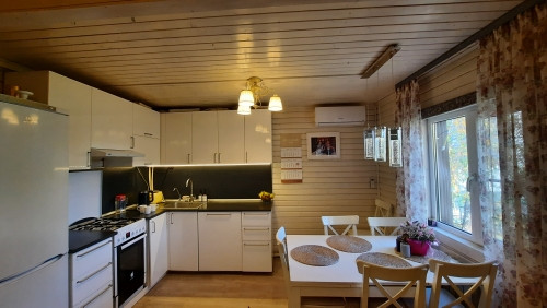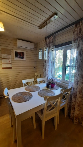 Дом построен из клеёного бруса 150×120 и утеплен 100мм. Фундамент ж/б сваи. Установлены качественные пластиковые окна, сделан хороший ремонт, полы ламинат. К дому пристроен хоз.блок, в котором находится прачечная и котельная. Вся мебель остаётся новым владельцам, техника частично.