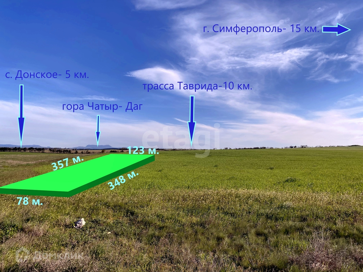Участок расположен на территории Донского с/п, в 5 км. от с. Донского, 10 км., до трассы Таврида, 15 км., до Симферополя.