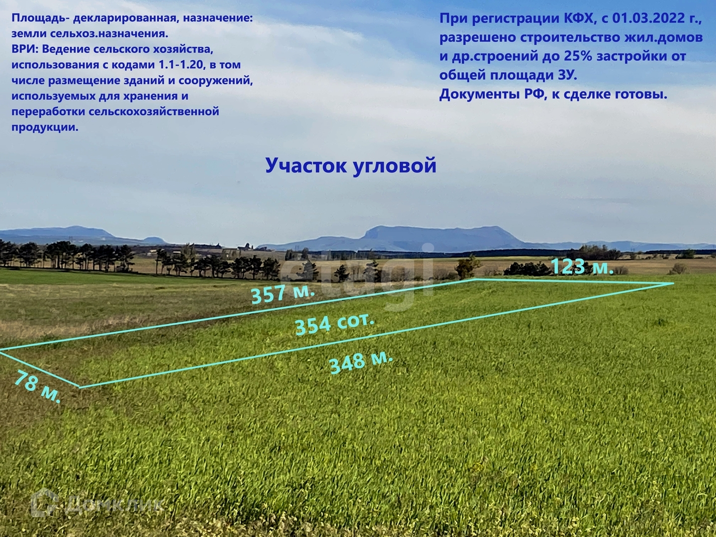 Площадь участка 354 сот., декларированная, назначение: земли сельхоз.назначения.