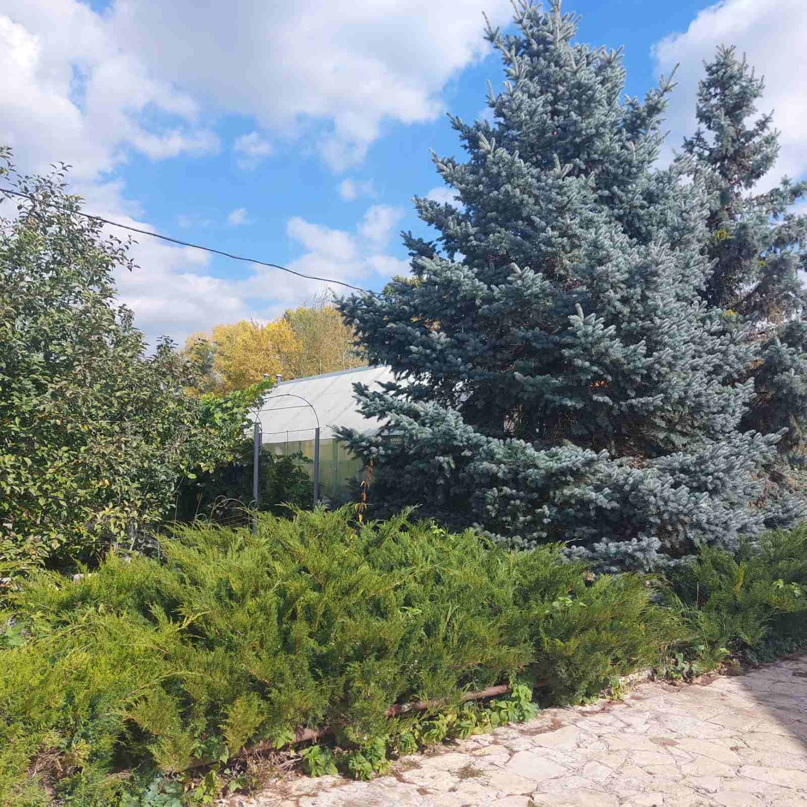 По всей территории выложены дорожки из природного камня. Вдоль дорожки ведущей к дому растут многолетние туи, ели, декоративные цветущие кустарники.
