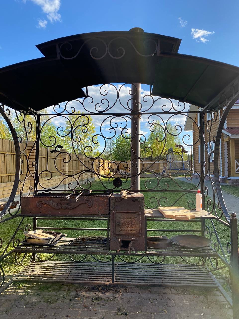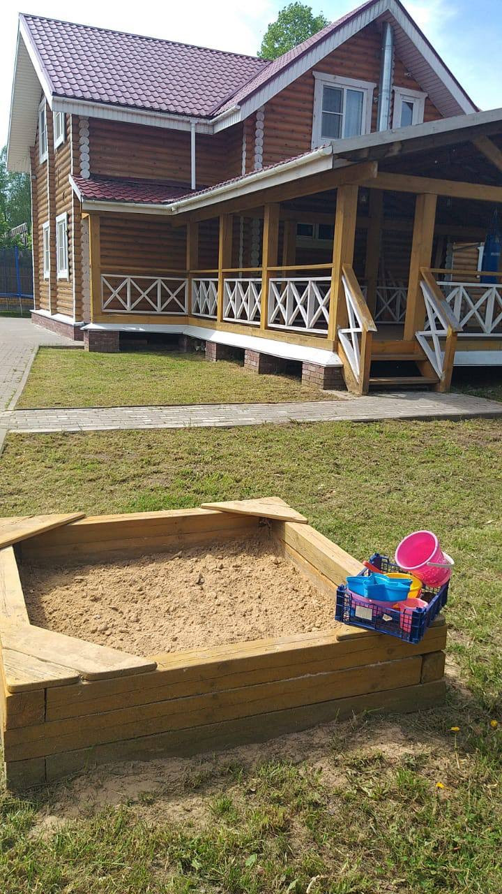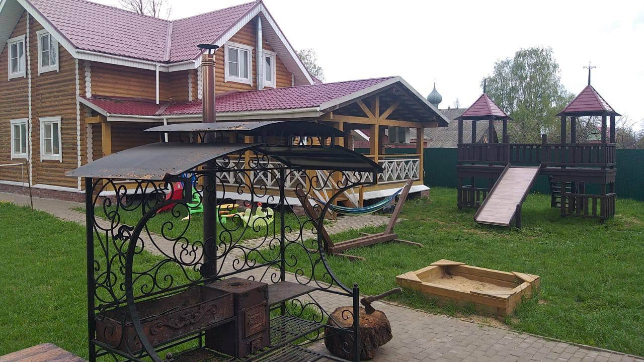 Территория огорожена забором, дорожки выложены брусчаткой, есть игровая зона для детей с горкой и песочницей. Придомовая территория полностью засажена газоном, высажены плодовые деревья и кустарники.