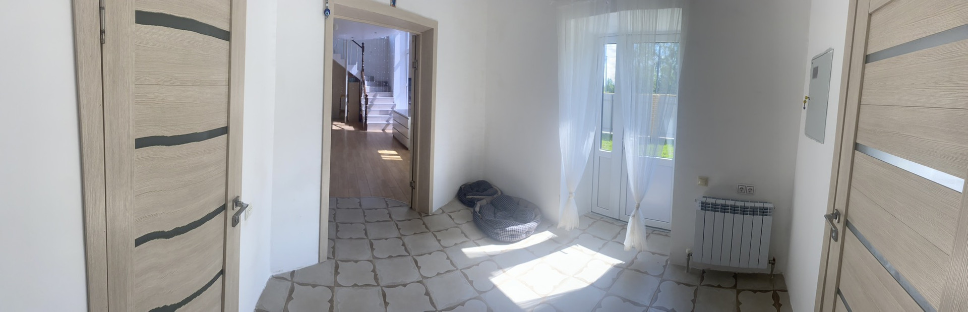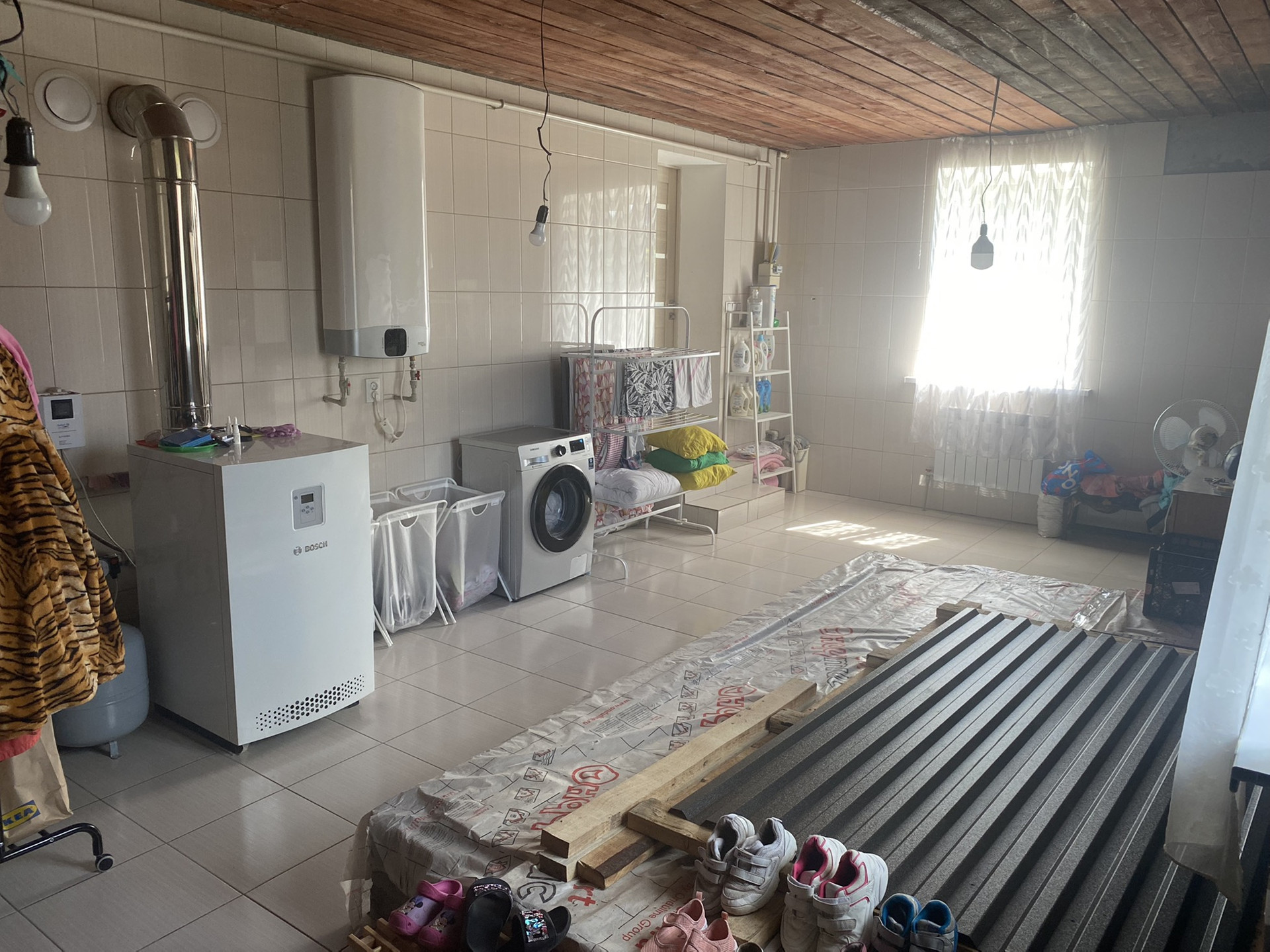Хоз.комната/котельная+сауна+душевая+бассейн. Тёплые полы по всему первому этажу,керамогранит,в спальнях ламинат.