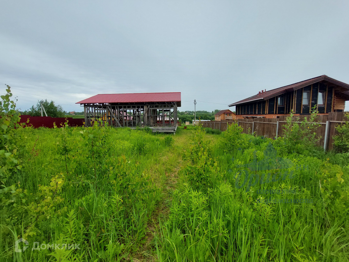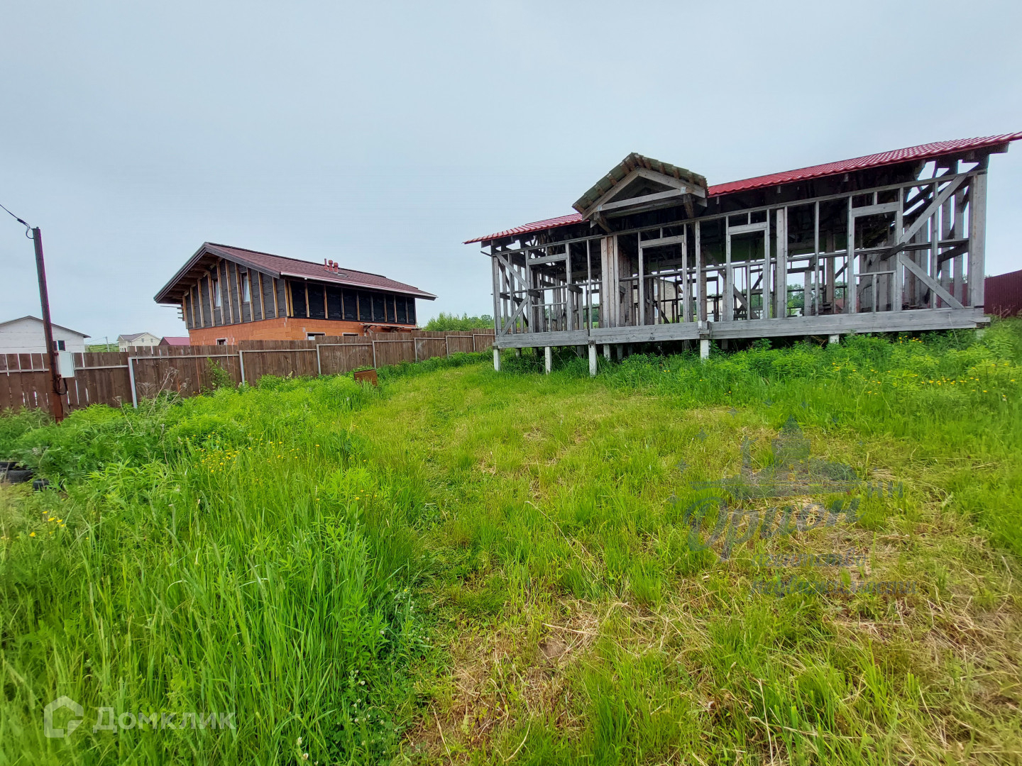 На участке расположен каркас дома 97,5 кв.м. Собран по проекту, из сушеной, обработанной огне-био защитой древесины. Обвязка фундамента из бруса 200*200. Фундамент свайный из железо-бетонных свай. Кровля, металлочерепица.