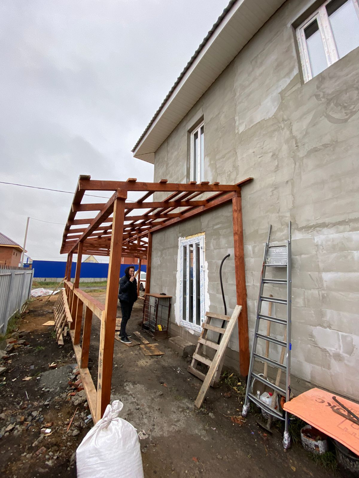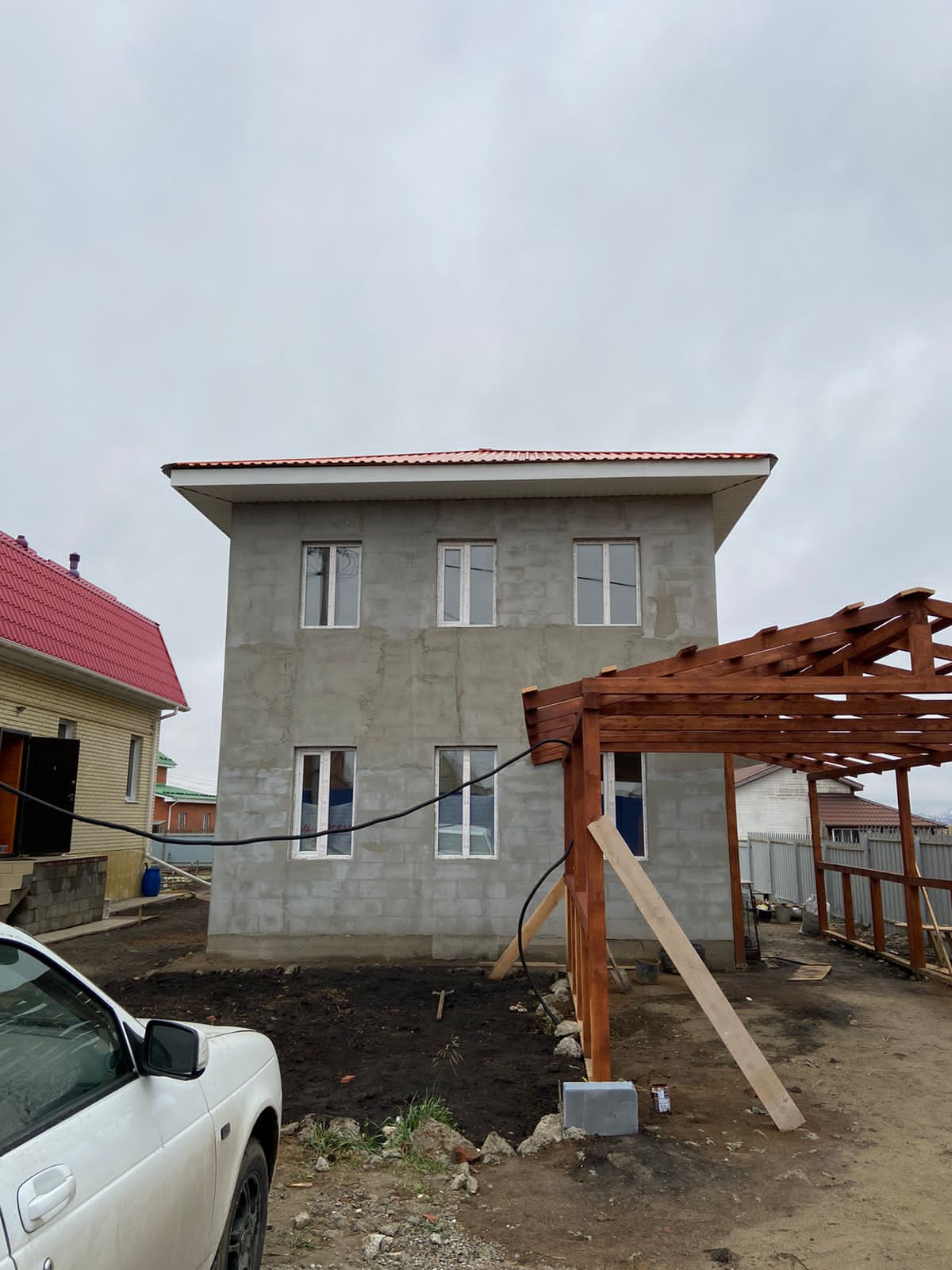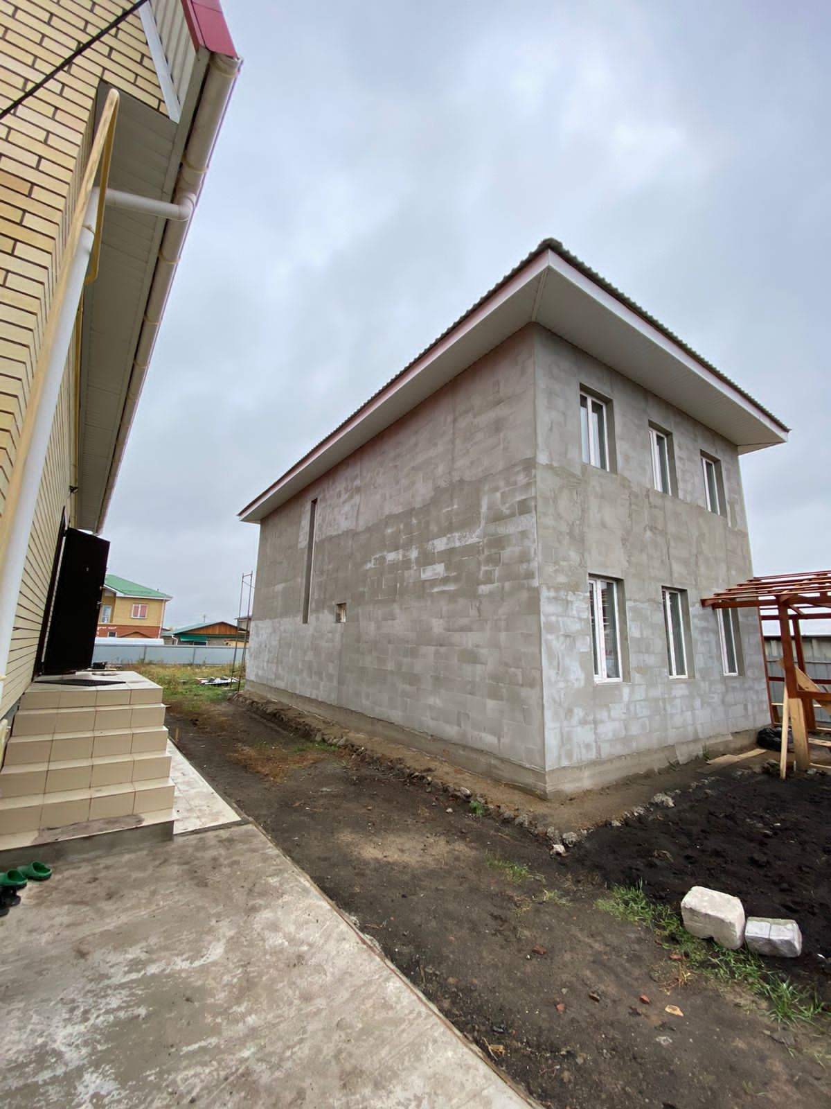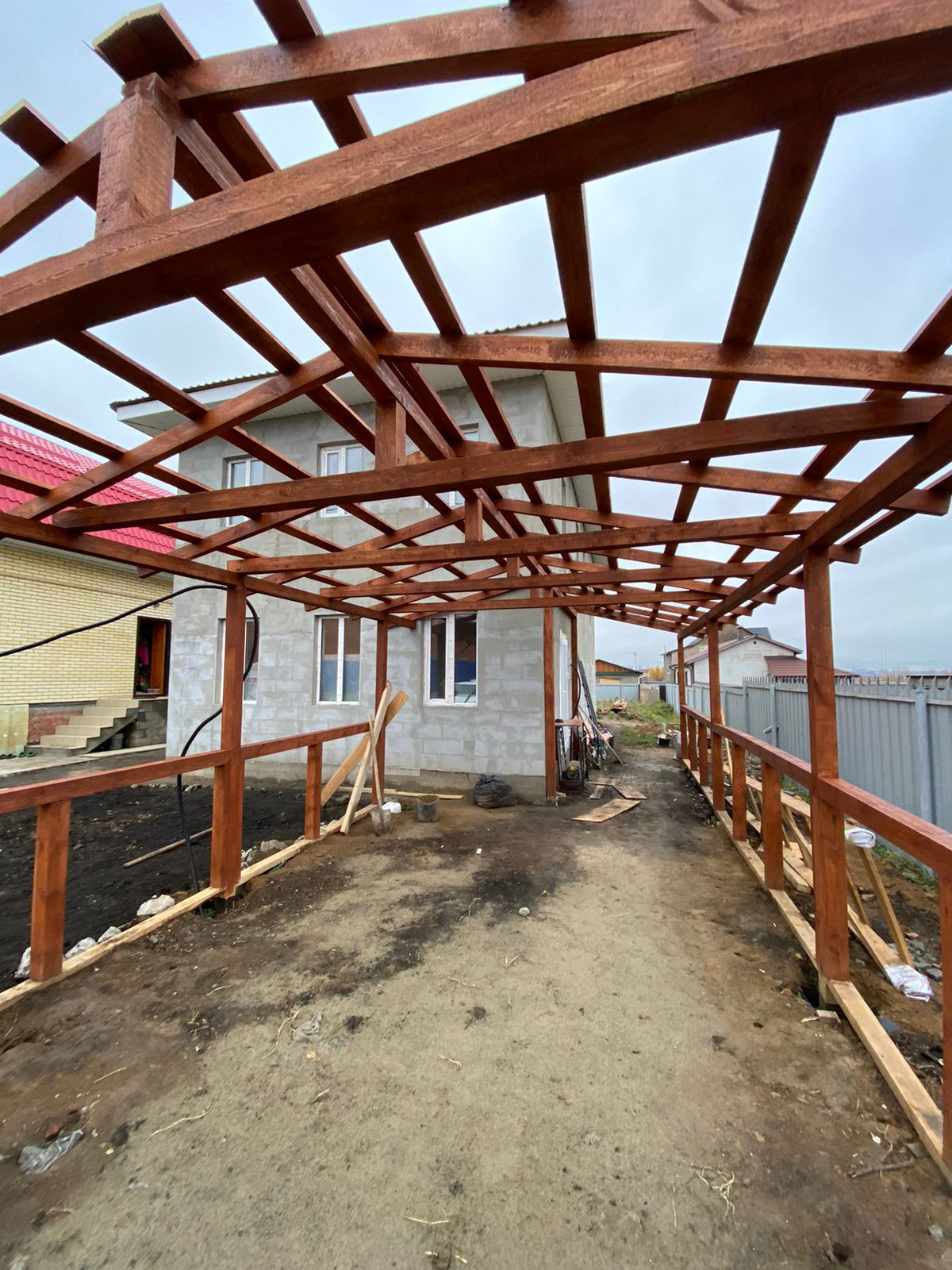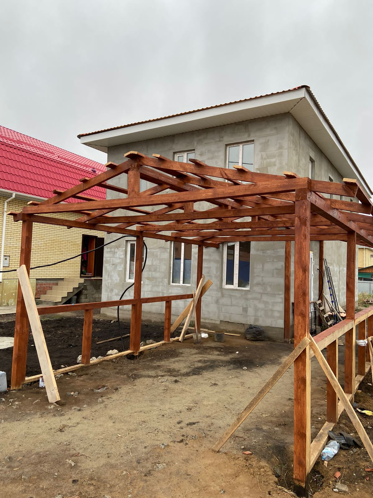 На улице имеется навес, покрашенный в цвет красного дерева. За домом огромное количество пространства, которое можно использовать в самых различных целях (огород, детская площадка, баня и т.д.)
