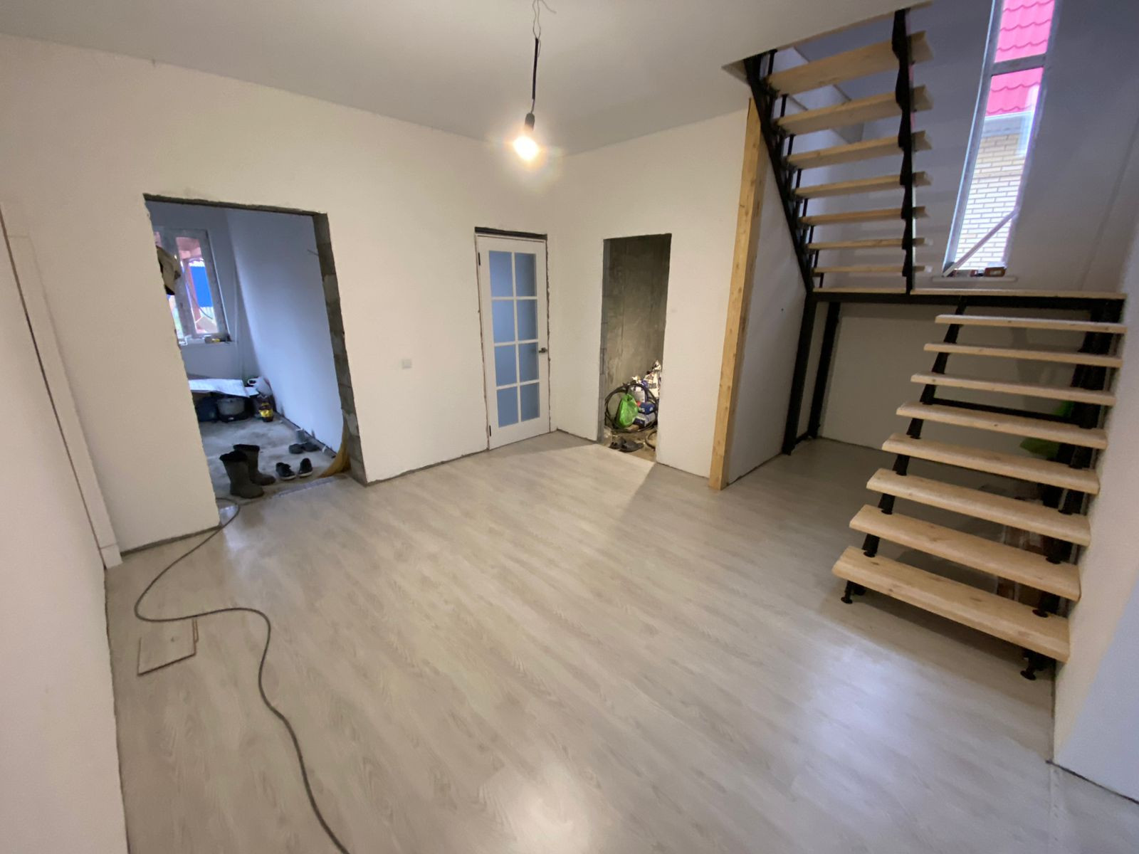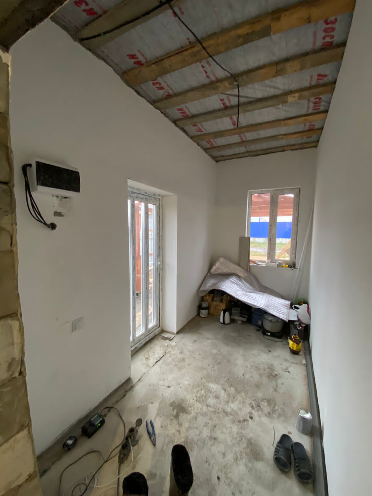 В доме произведена чистовая отделке, стены готовы под обои, полы 1 этаж ламинат, натяжные потолки, разводка электричества.