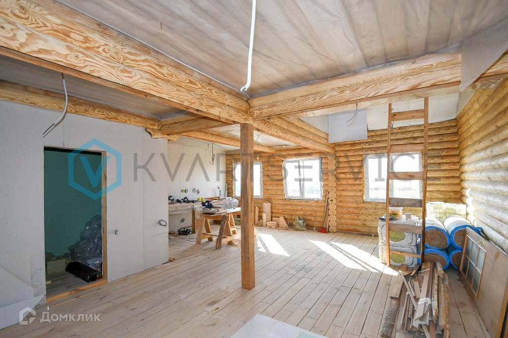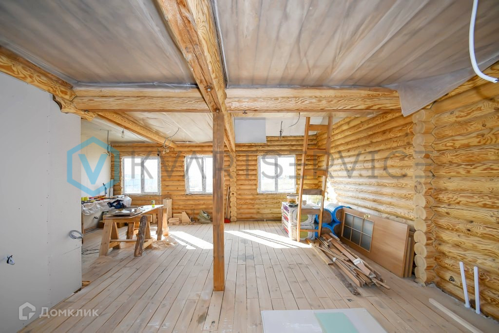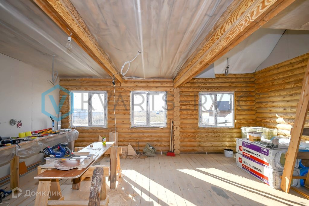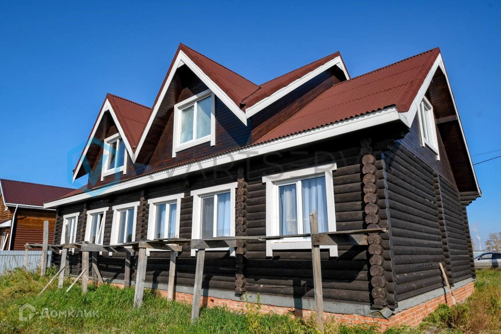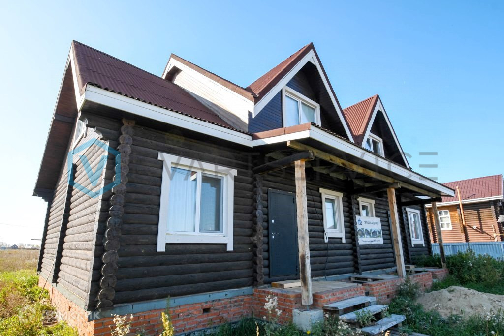 Дом на ленточном фундаменте, стены дома из оцилиндрованного бревна, окна ПВХ, крыша профнастил.