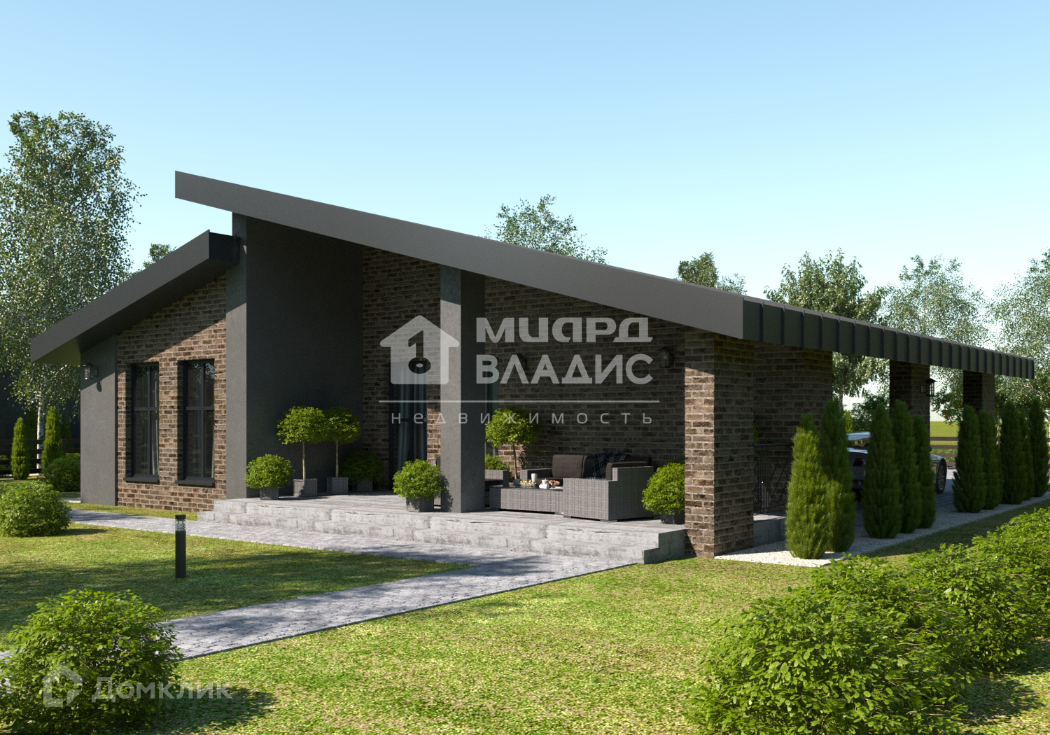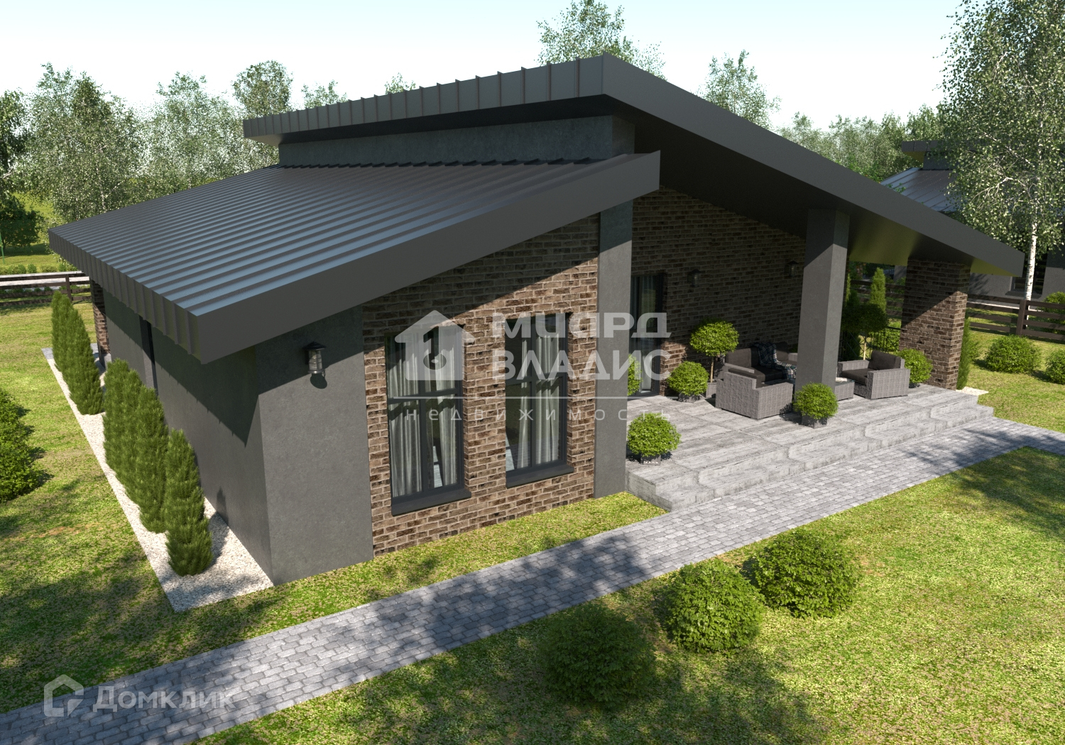 Дом с панорамными окнами и закрытой террасой, построен из экологических материалов – арболит.