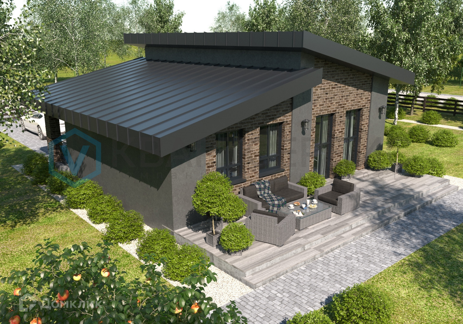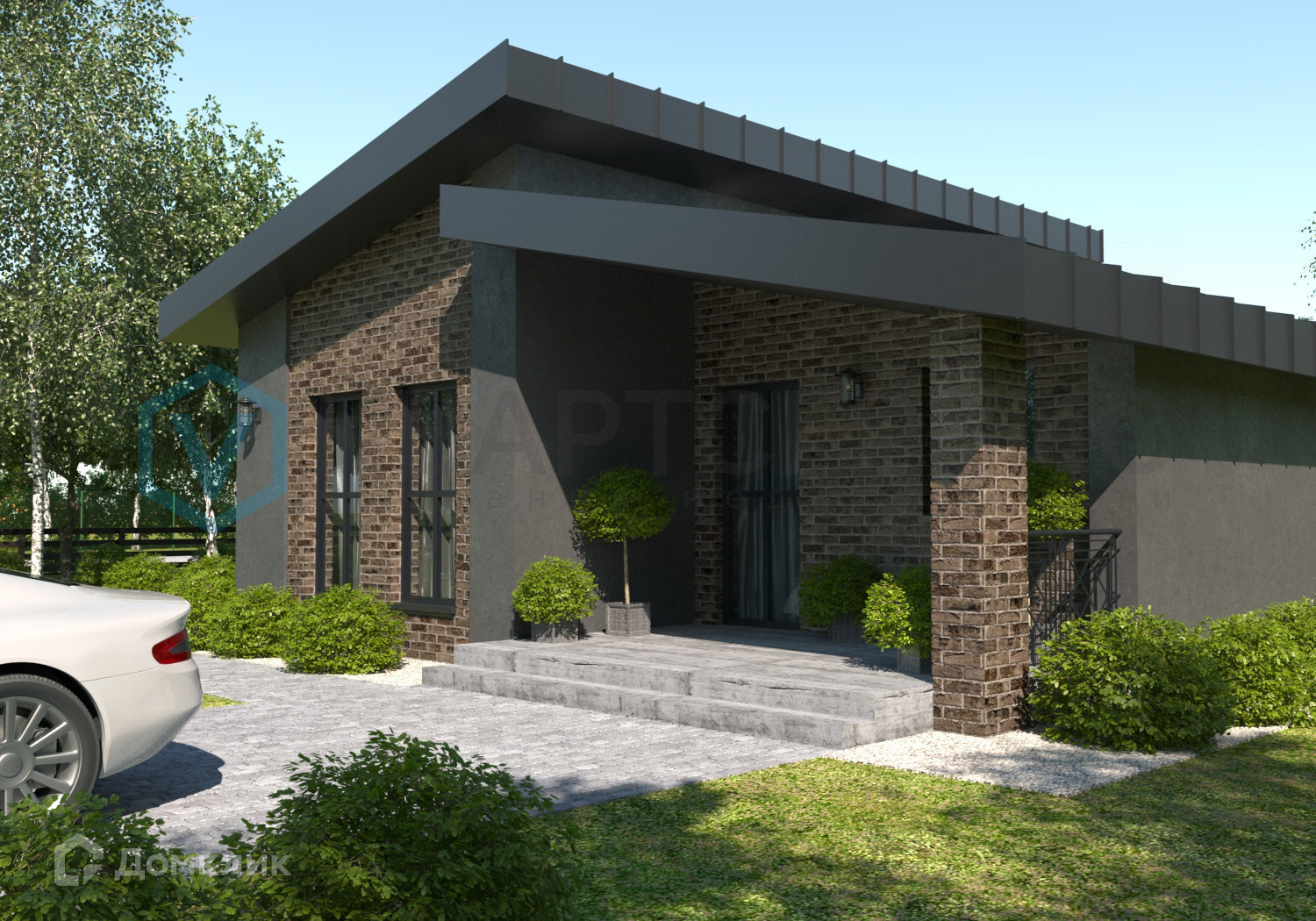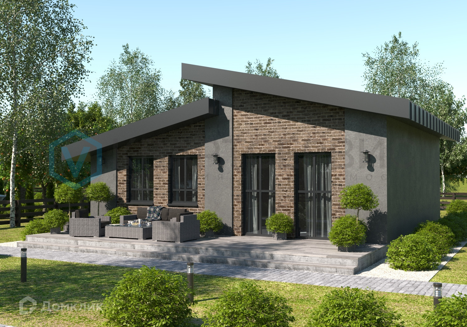 Одноэтажный дом с панорамными окнами и большой террасой в 8 кв.м станет уютным жильем для семьи с детьми. Есть возможность разработать планировку с тремя комнатами.