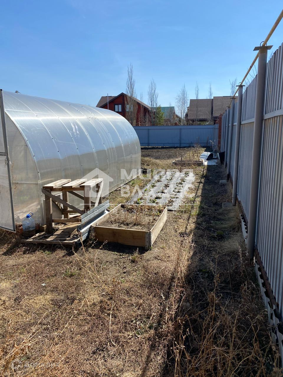 Теплица 3*6 м, профиль оцинкованный, автоматическая форточка. На участке посажены кустарники и деревья: малина, вишня, облепиха, смородина, яблони и многое другое.