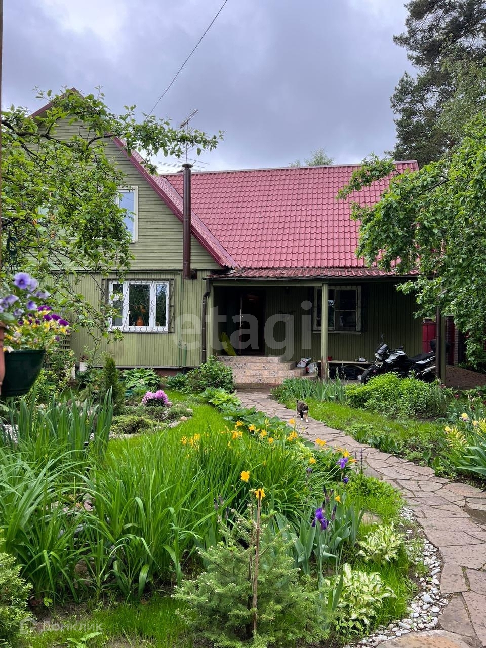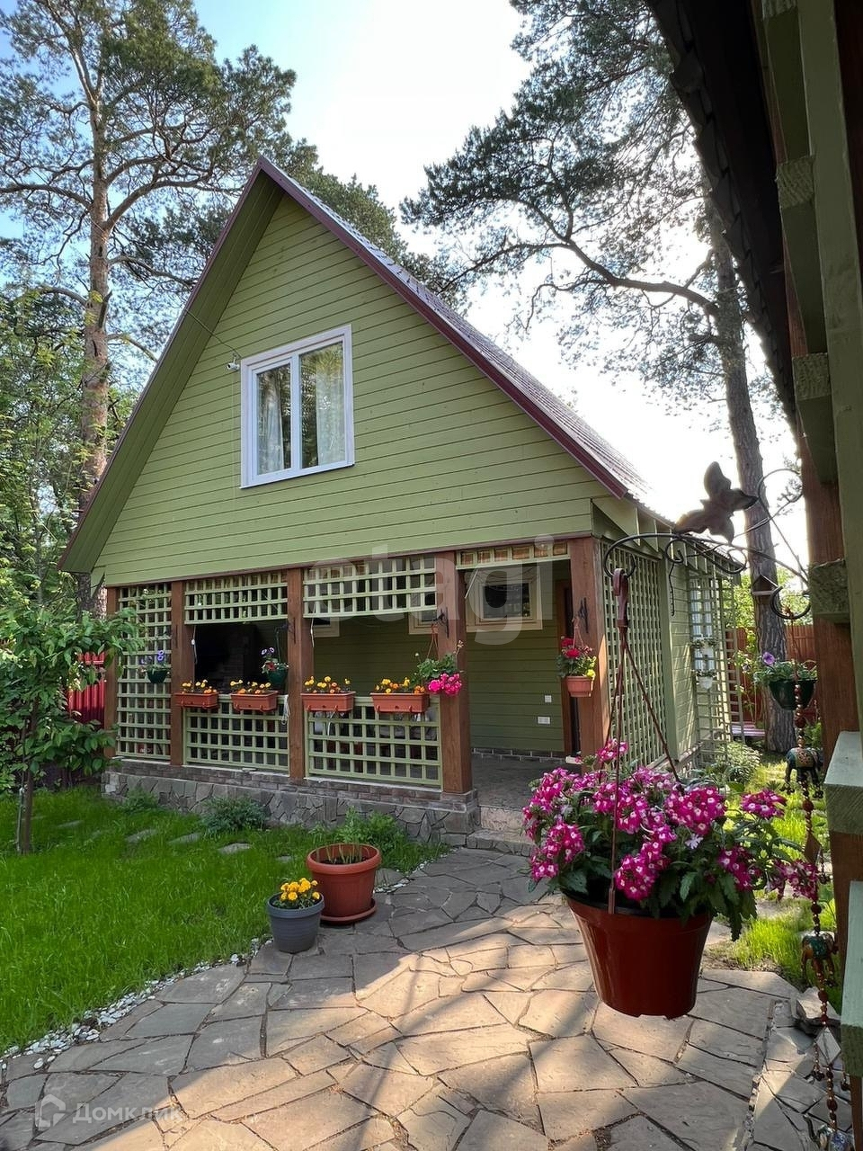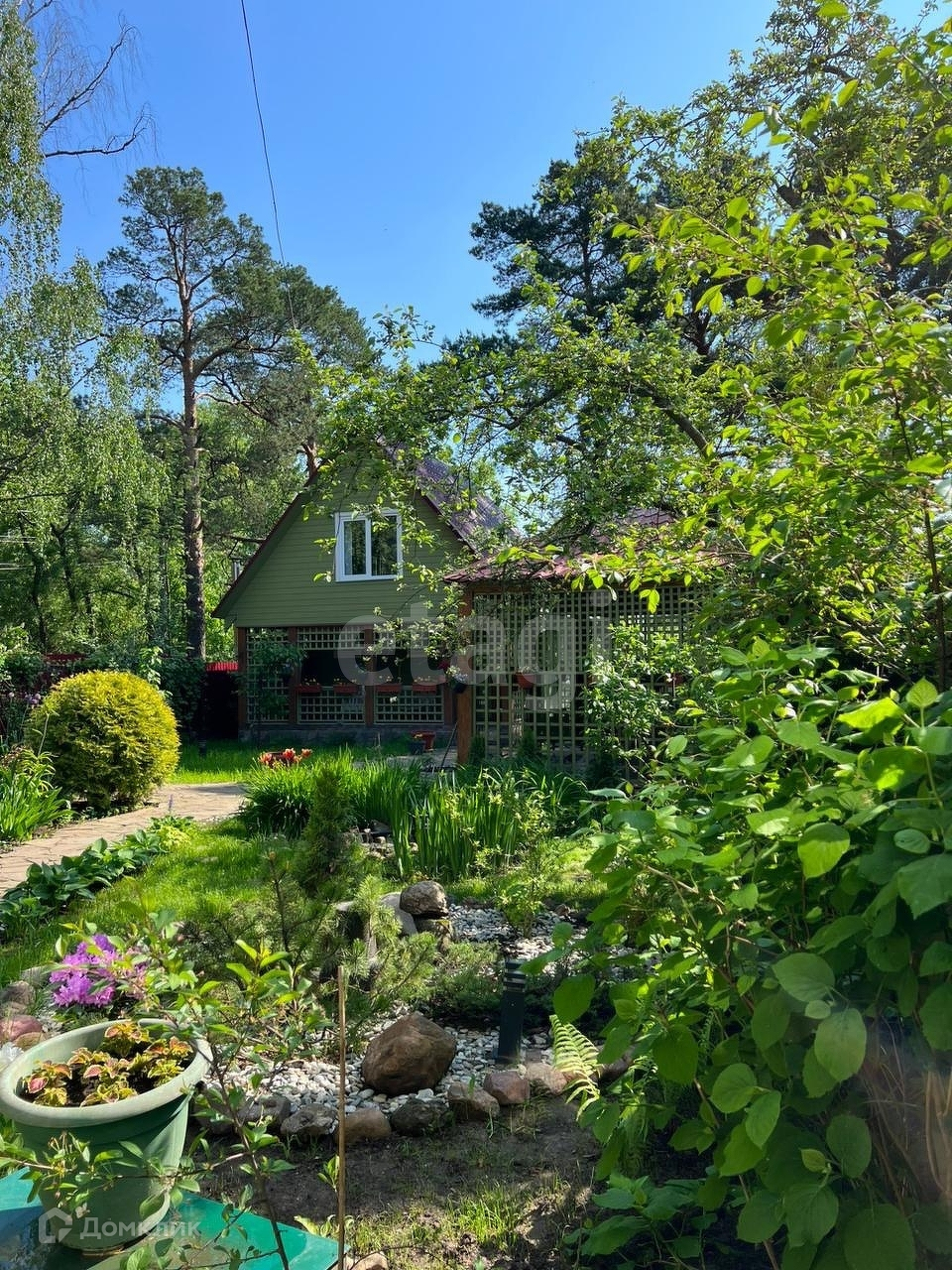 На участке растут вековые сосны и плодовые деревья.