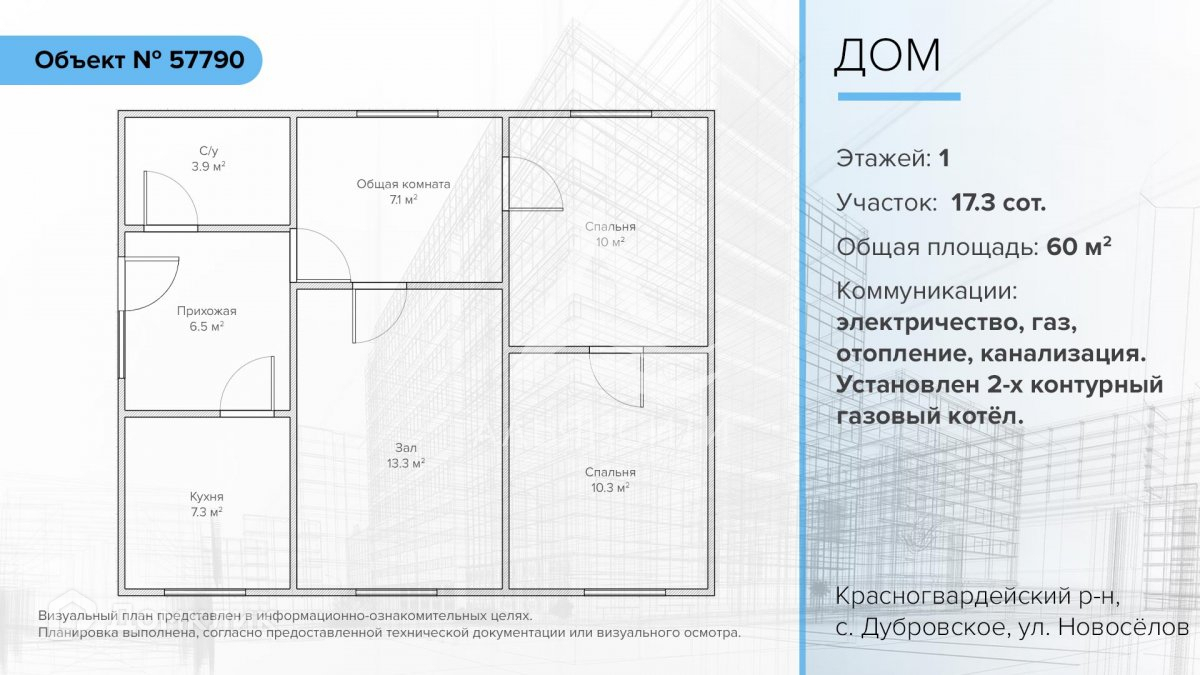 В продаже дом Красногвардейский р-н, Котельниковское сельское поселение, с. Дубровское, ул. Новосёлов. Общая площадь дома 60 м2. Площадь земельного участка 17,3 сотки. Назначение земли: индивидуальное жилищное строительство.