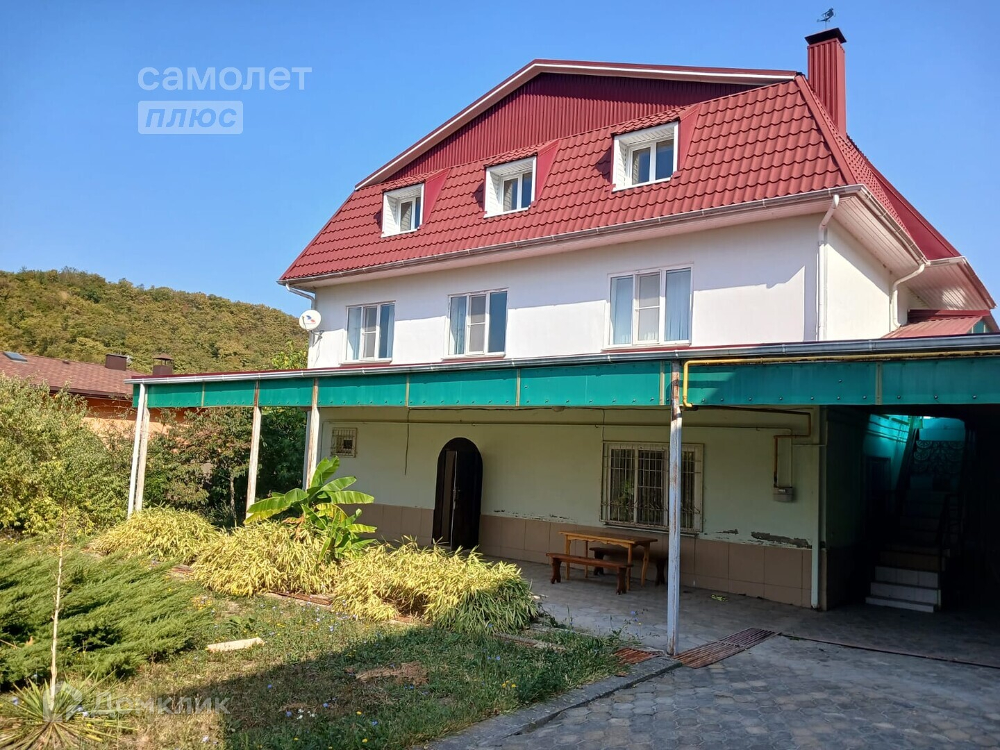 В восточной стороне дома навес, стоянка на 10 автомобилей. Двор уложен плиткой. Имеется садовый участок, летняя кухня, две душевые кабины, два туалета. Дом 2010 года постройки.