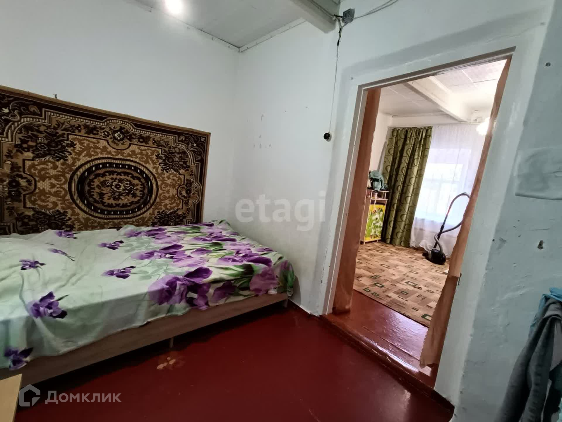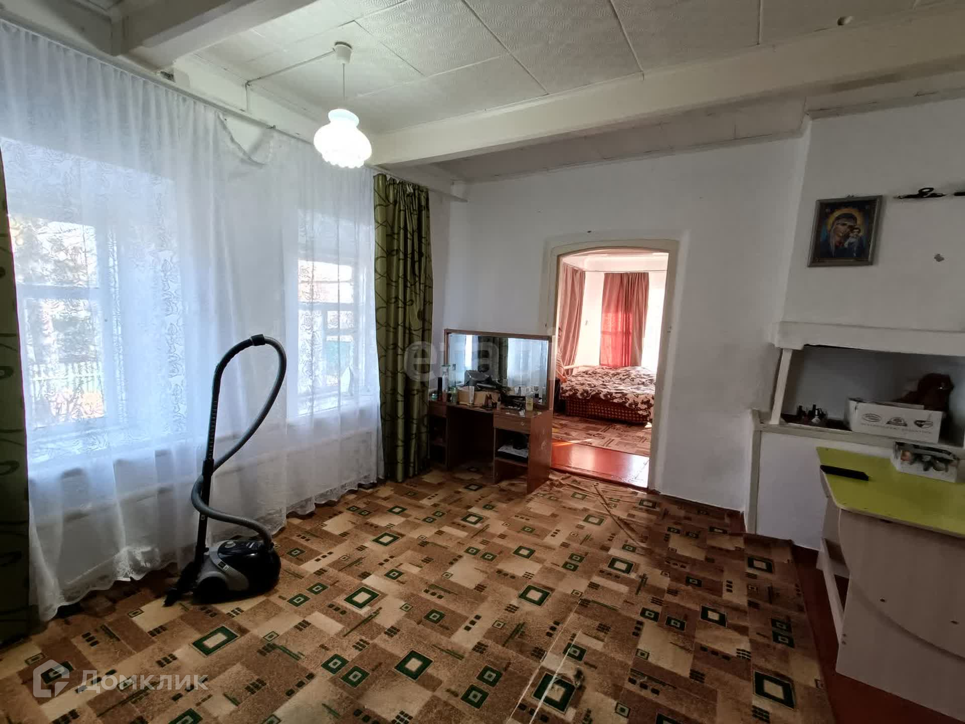 В доме 4 комнаты, кухня 13 м2, прихожая, совмещенный санузел. Отопление газовое, вода-центральная, слив-септик, электричество. В помещении чисто, стены побелены, на полах линолеум и ДВП.