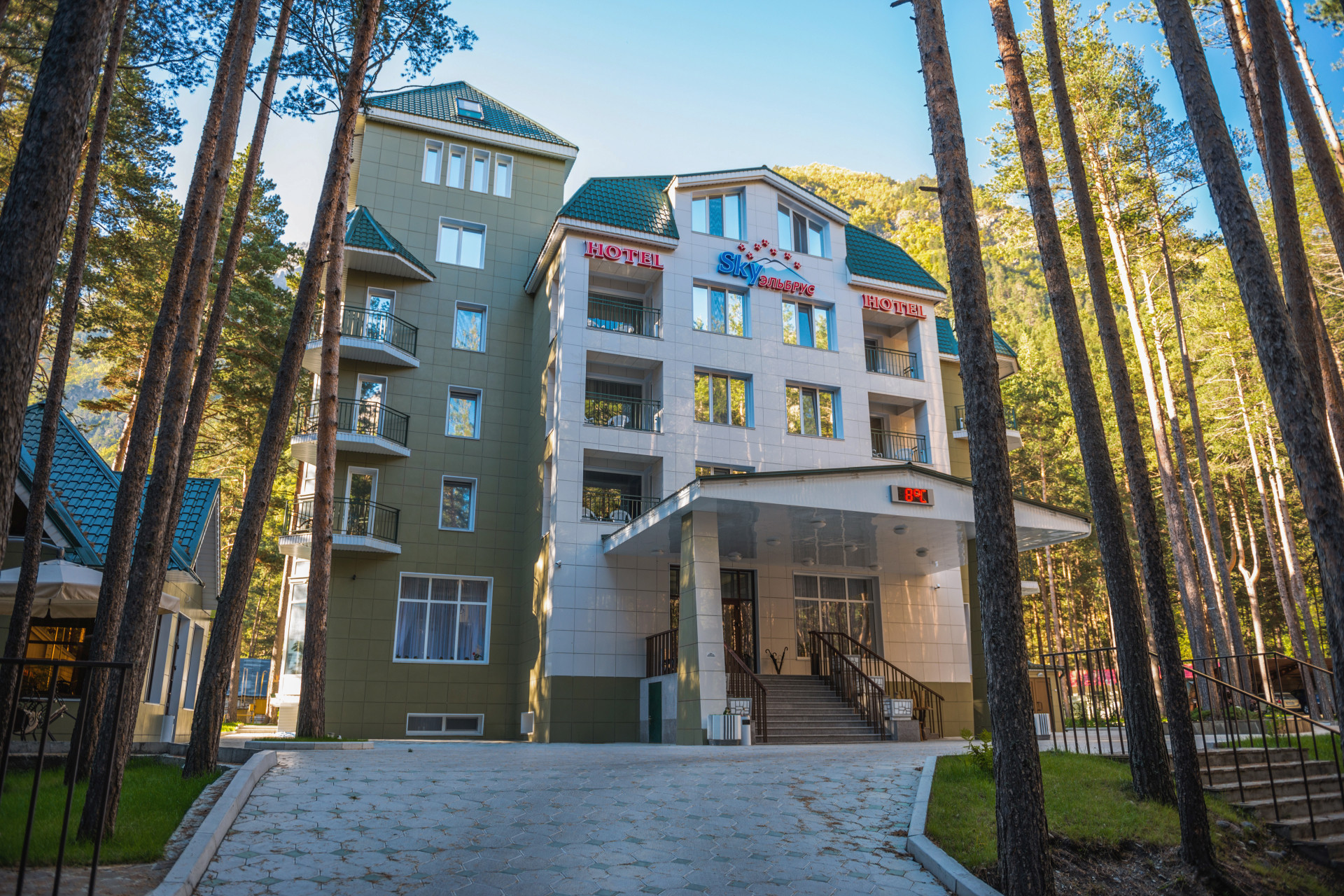 Отель Sky Эльбрус в Приэльбрусье располагает всем необходимым для полноценного отдыха: рестораны, сауна с бассейном, SPA, массажный кабинет, лаунж-зоны, Бильярдный зал, спортивные и игровые площадки, мангалы и камины, беседки и домики для мероприятий. Вокруг отеля 5 Га благоустроенной охраняемой территории и 50 Га хвойного леса с двумя горными реками Баксан и Адыл-Су, в лавино-безопасном районе.