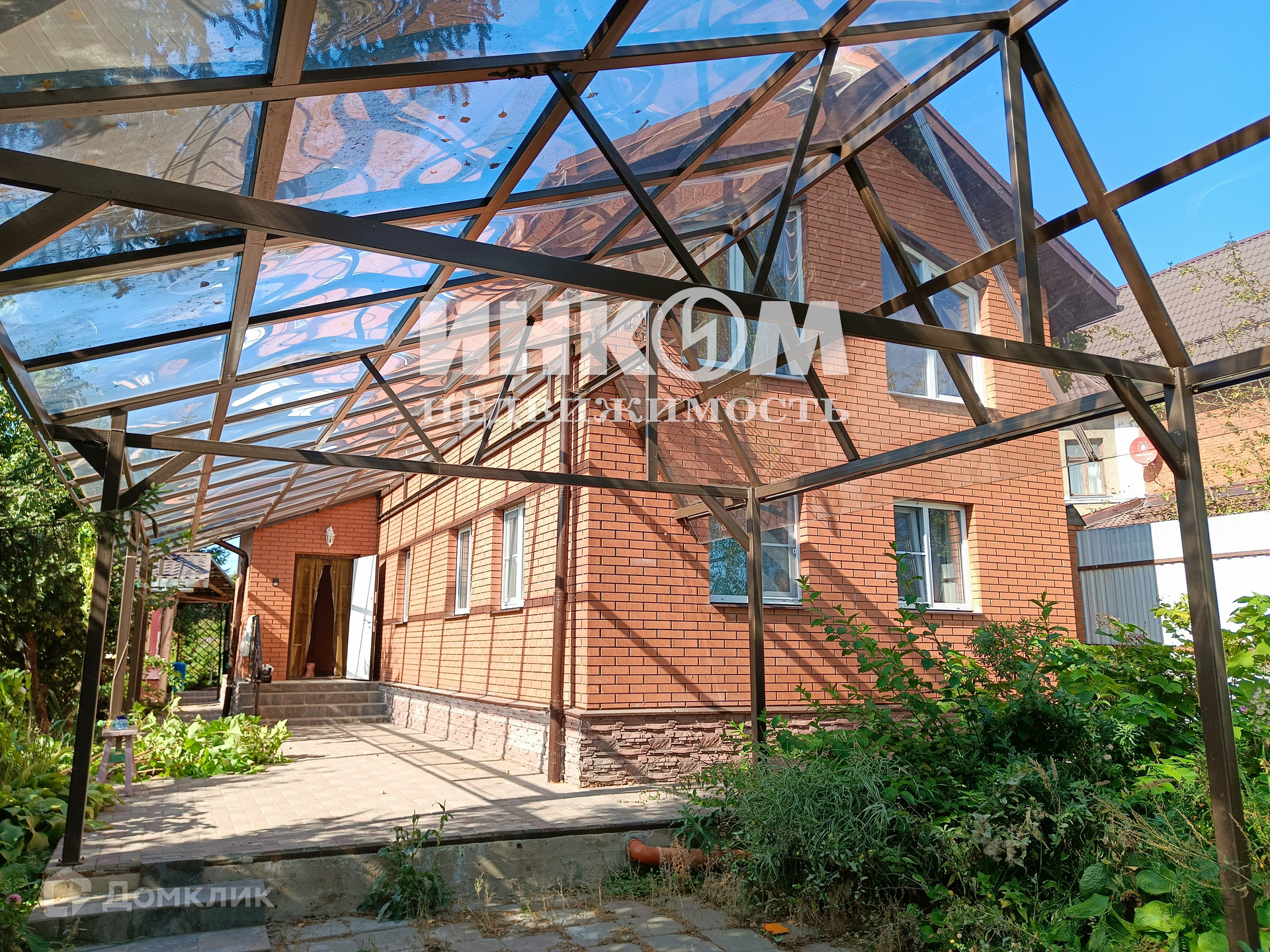 - Придомовое пространство поднято над землёй на 40 см, и выложено тротуарной плиткой. НАД сделан навес из металлоконструкций с покрытием из прозрачного поликарбоната (защита от снега и дождя).
