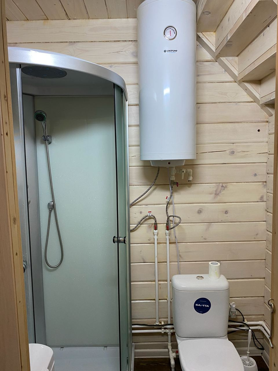 ⁃ Ванная комната полностью оборудована: установлен бойлер UniPump на 80 литров, душевая кабина, стиральная машина (Zanussi), унитаз и шкафчик с подсветкой.