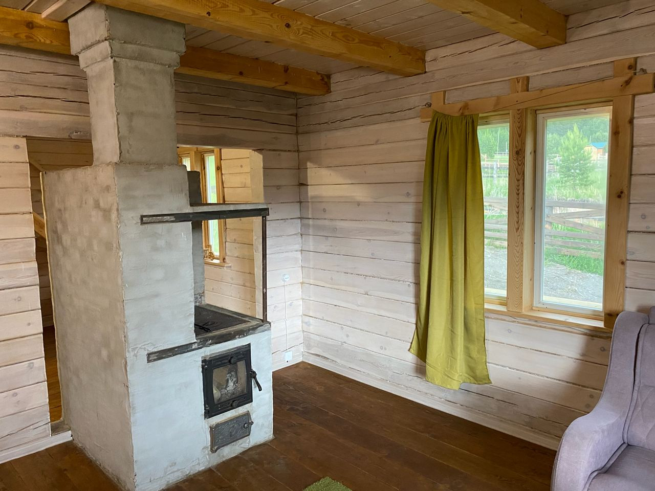 ⁃ В кухонной зоне установлена печь для автономности тепла, со стеклом, что позволяет любоваться огнем в зимнее время года (вариант замены камина).