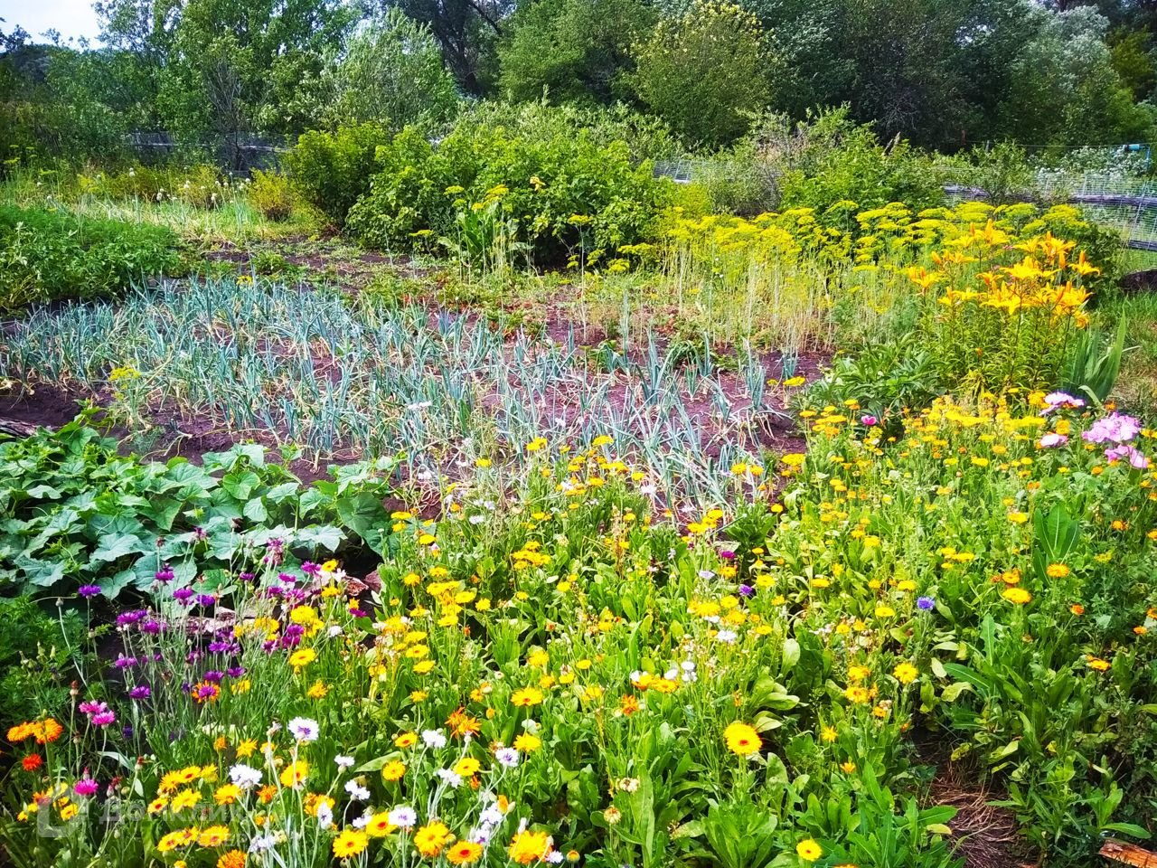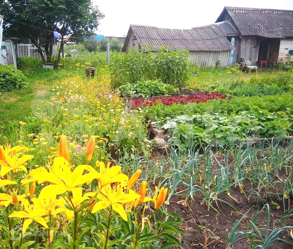 На участке имеются смородина, клубника, яблоня, вишня, много цветов.