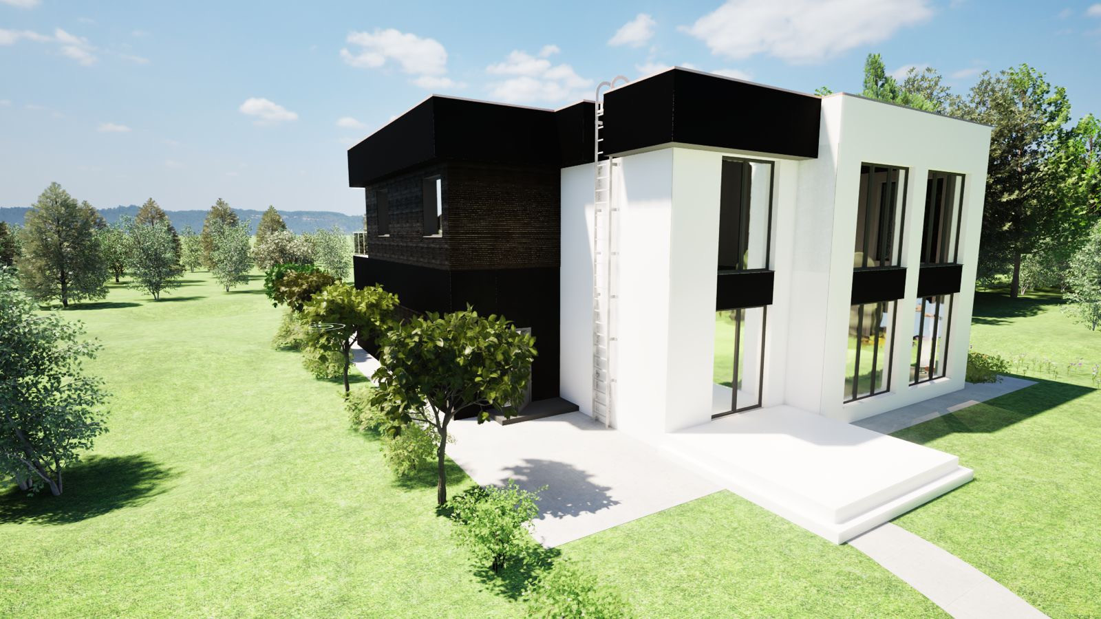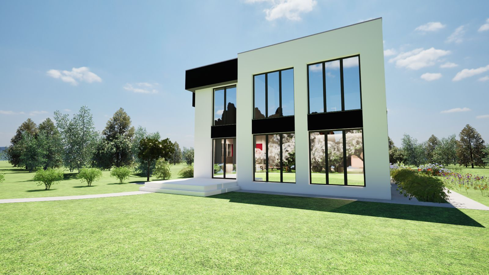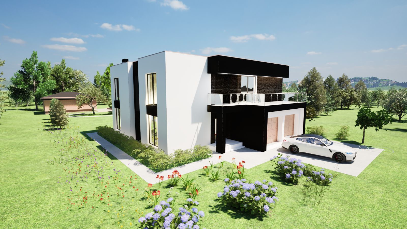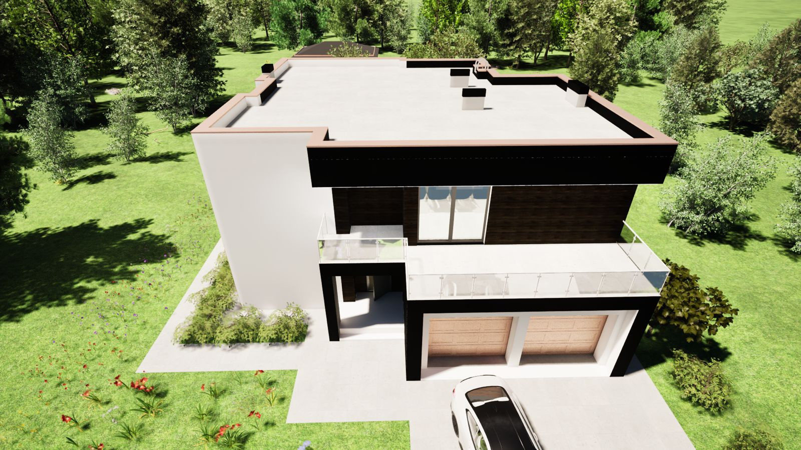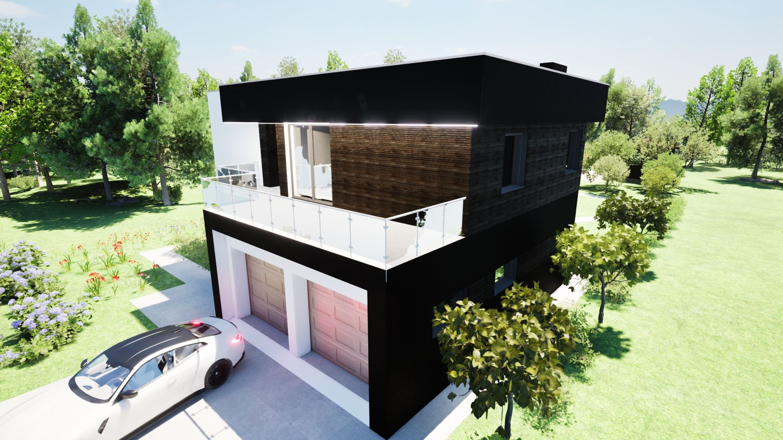 Вашему вниманию представляем двухэтажный премиальный коттедж с плоской кровлей, гаражом на 2 автомобиля, балконом, верандой и вторым светом в кухне-гостиной.