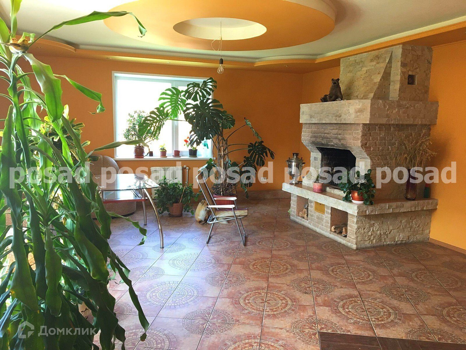 большой зал с камином, туалет, ванная комната.