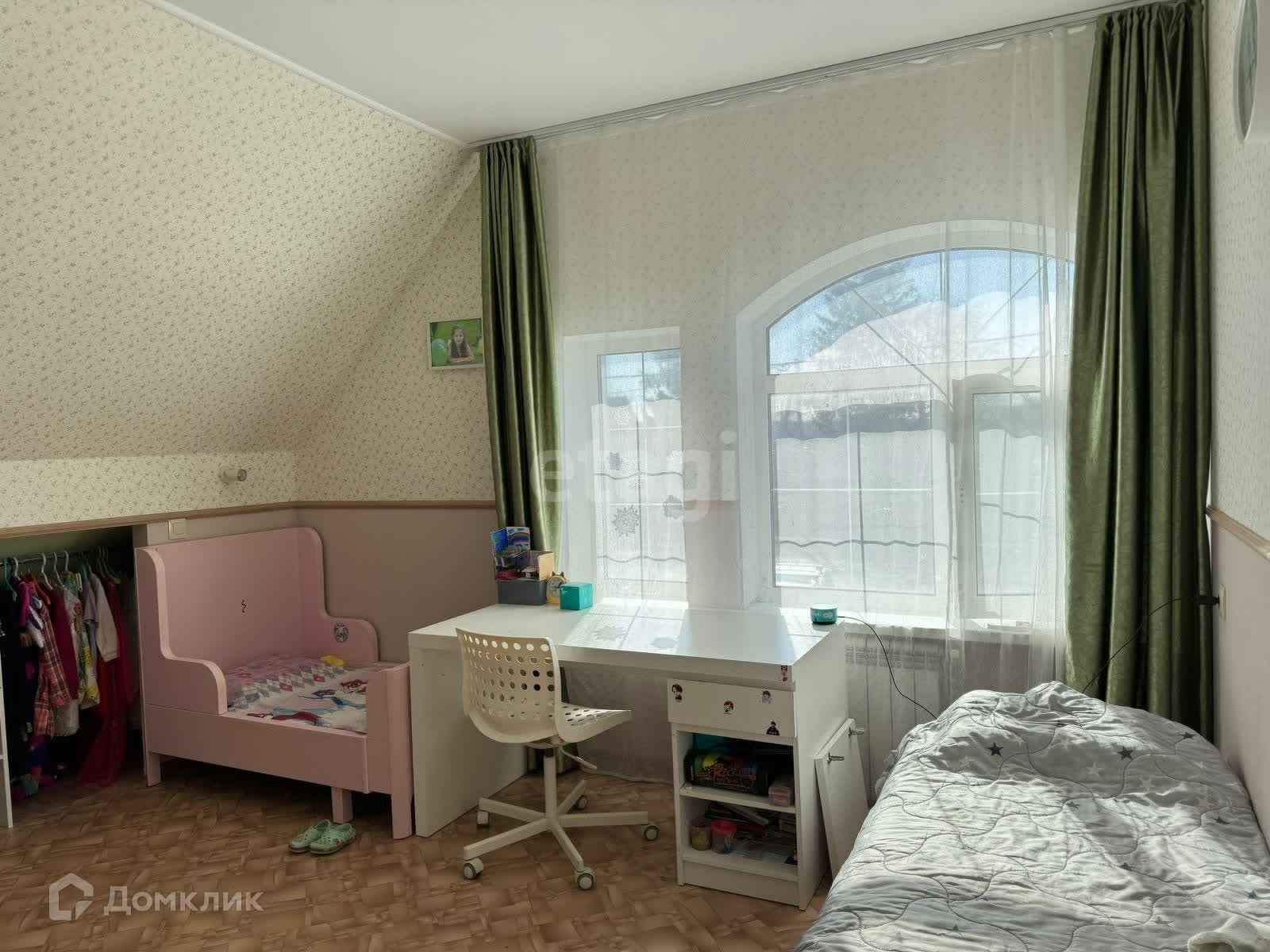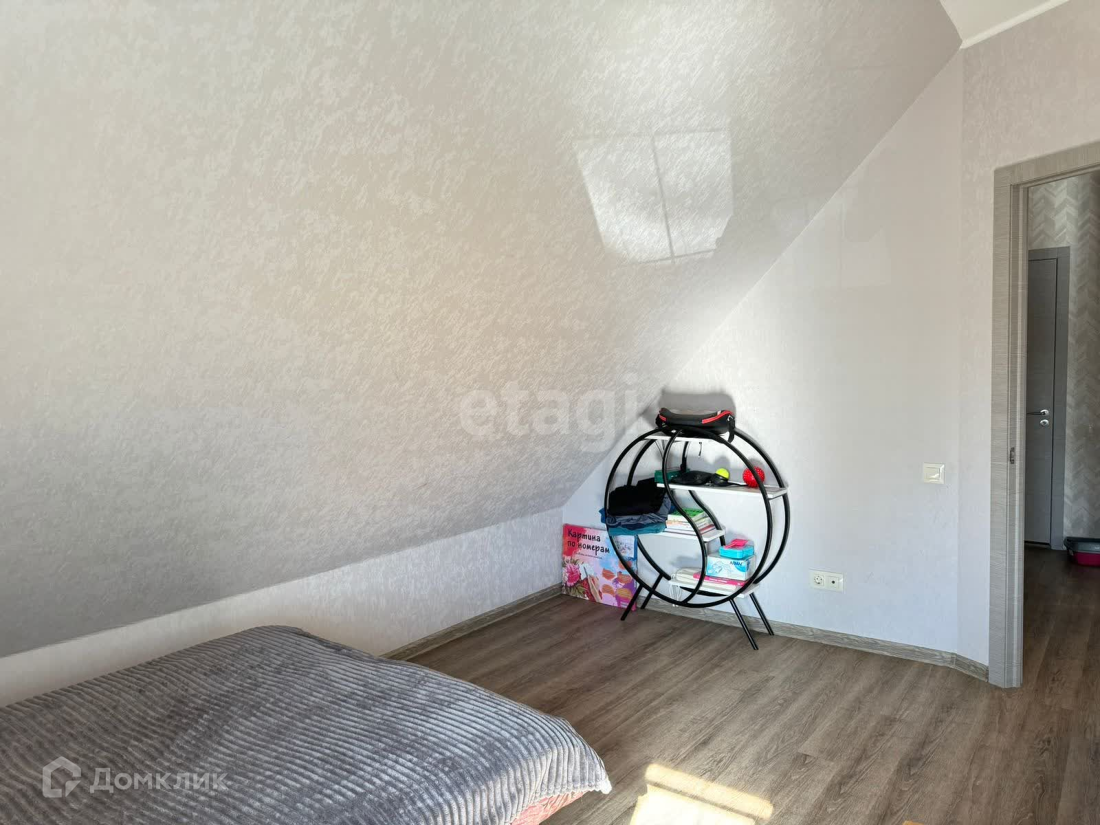 На первом этаже спальня, гостиная, кухня, кладовая-постирочная, сан узел. На втором этаже 3 спальни, в одной из них гардеробная и выход на балкон, сан узел.