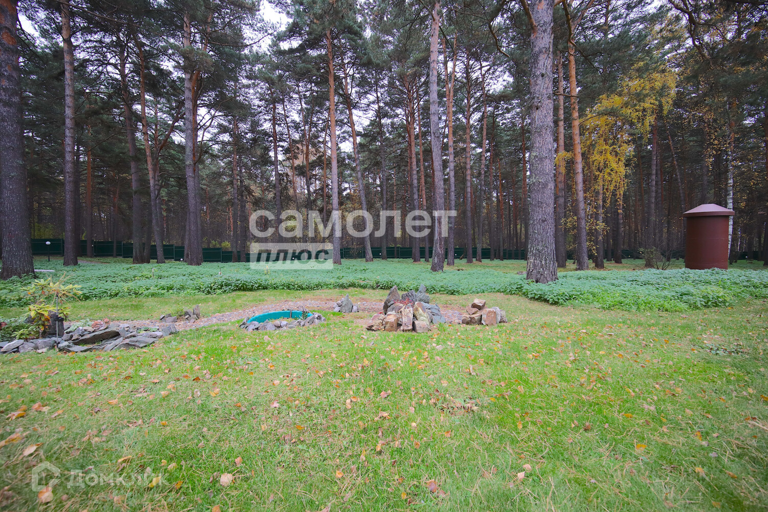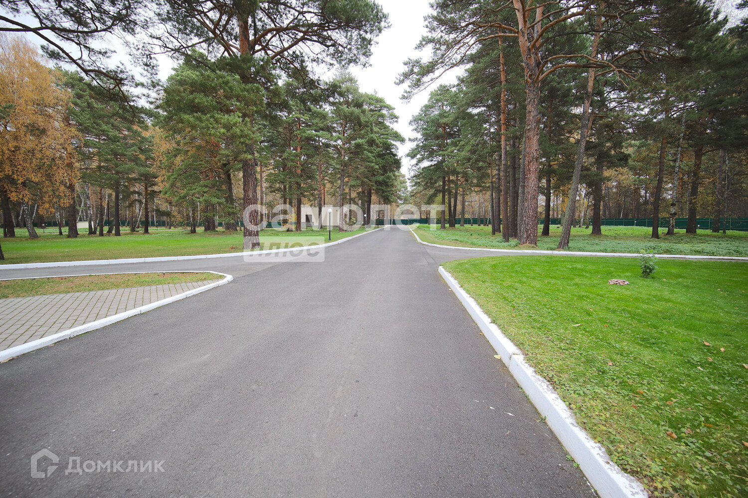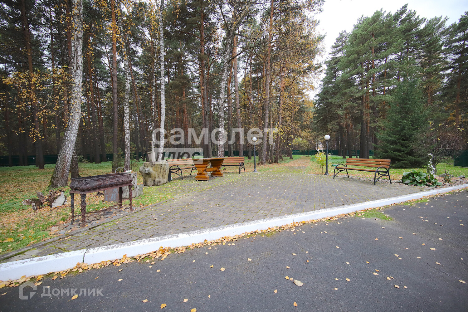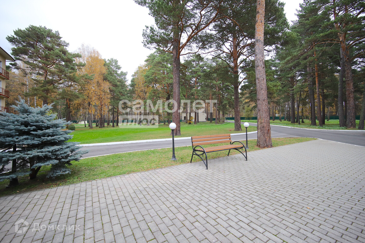 Территория - парк с множеством хвойных деревьев и берёз. По всей территории газоны, декоративные кусты, за которыми ухаживает садовник.