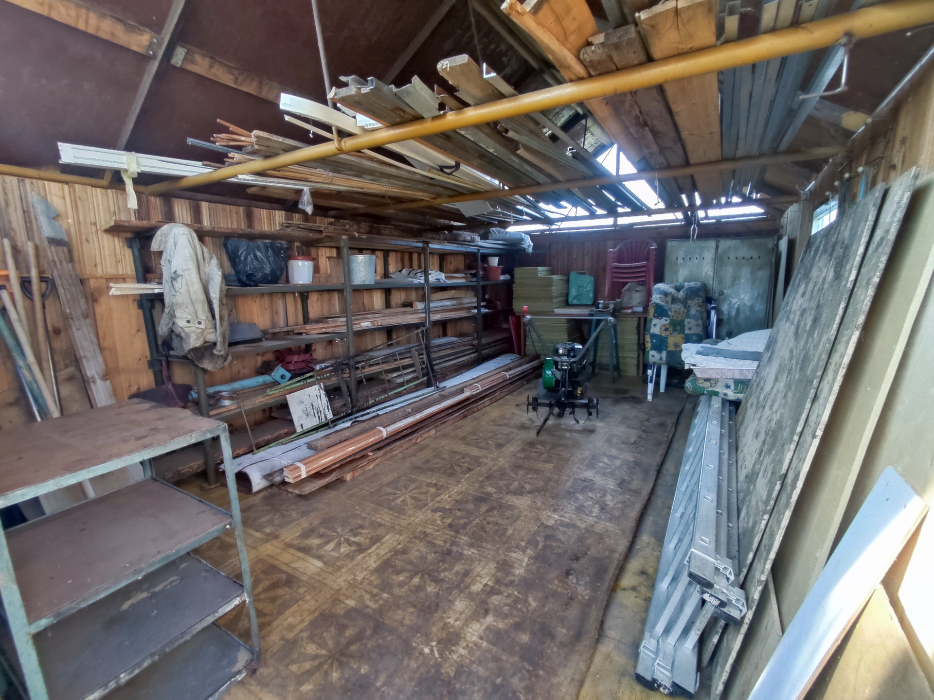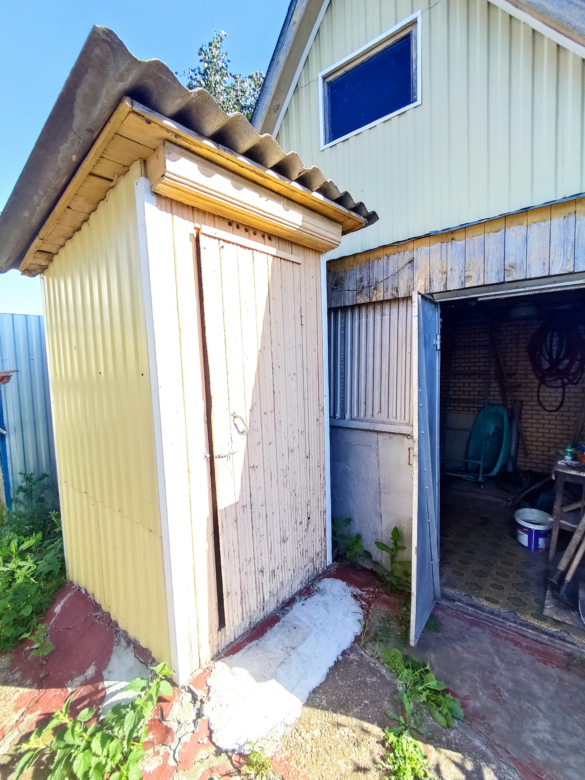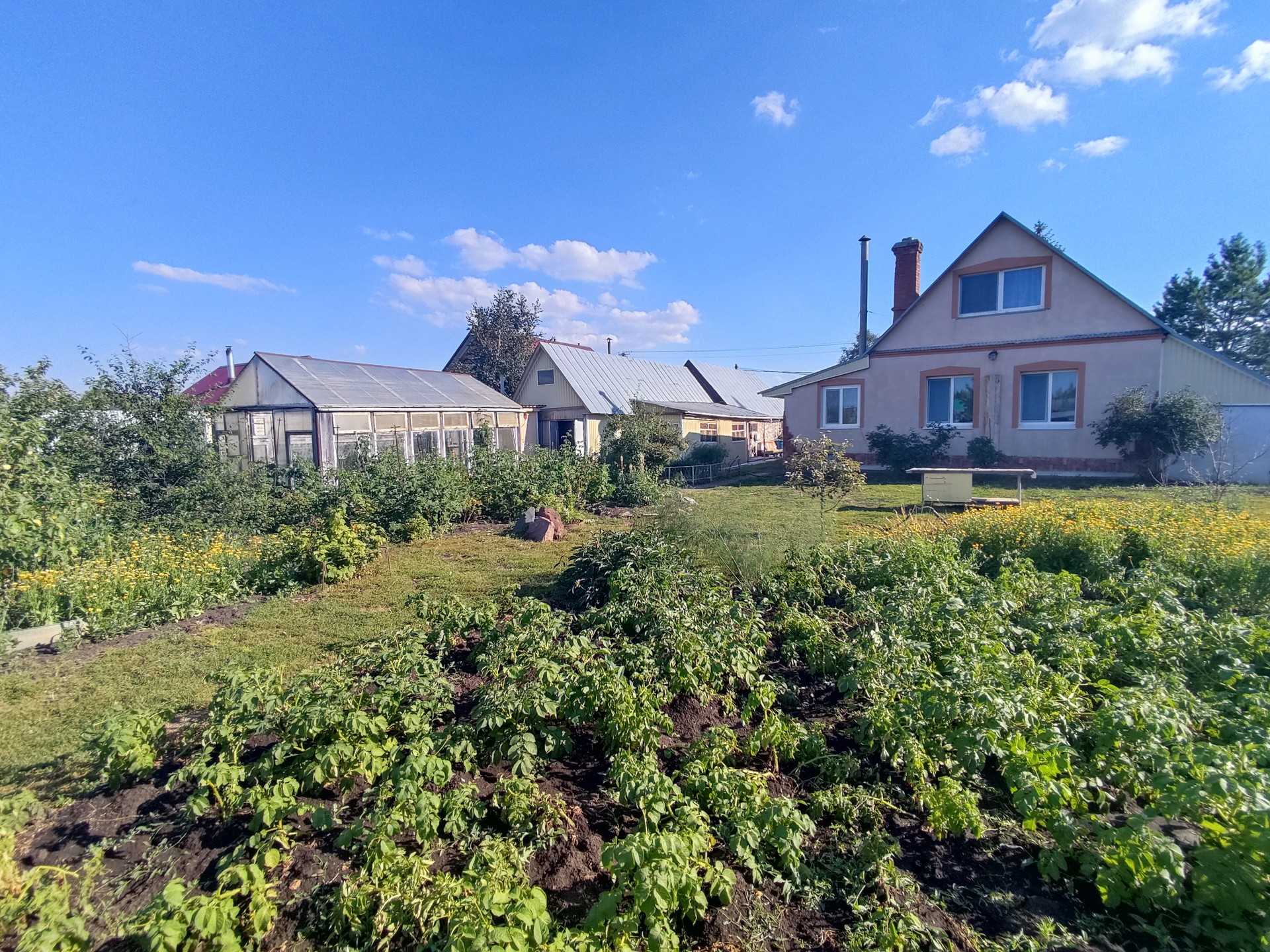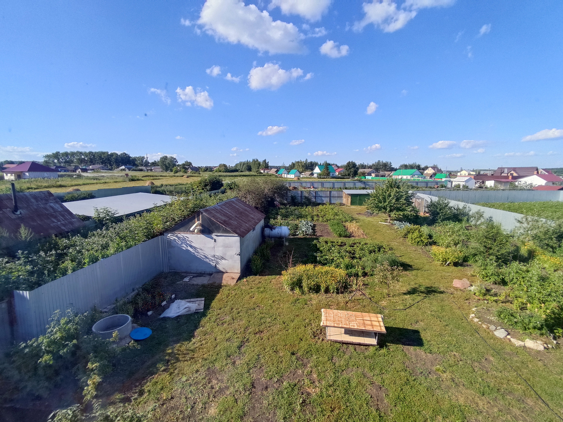 На участке имеется 2 стеклянные теплицы, металлический гараж, складские помещения, баня, дровеник, капитальный гараж из блоков на 2 машины, погреб в гараже для хранения солений, бочки для сбора воды, 2 скважины разной глубины.