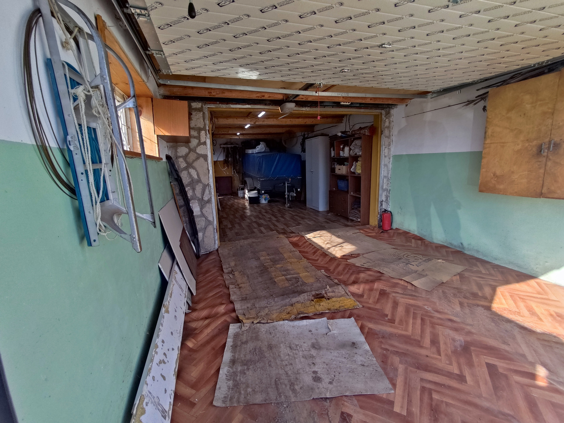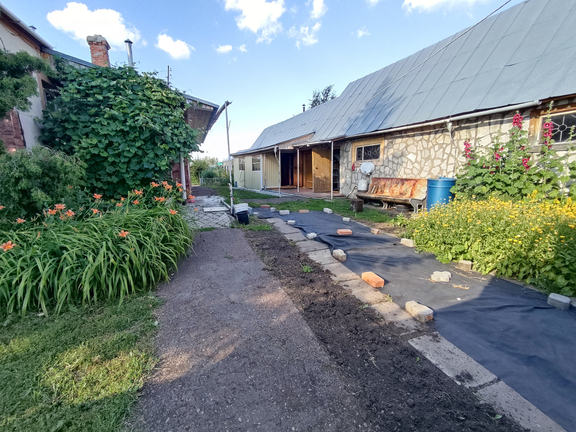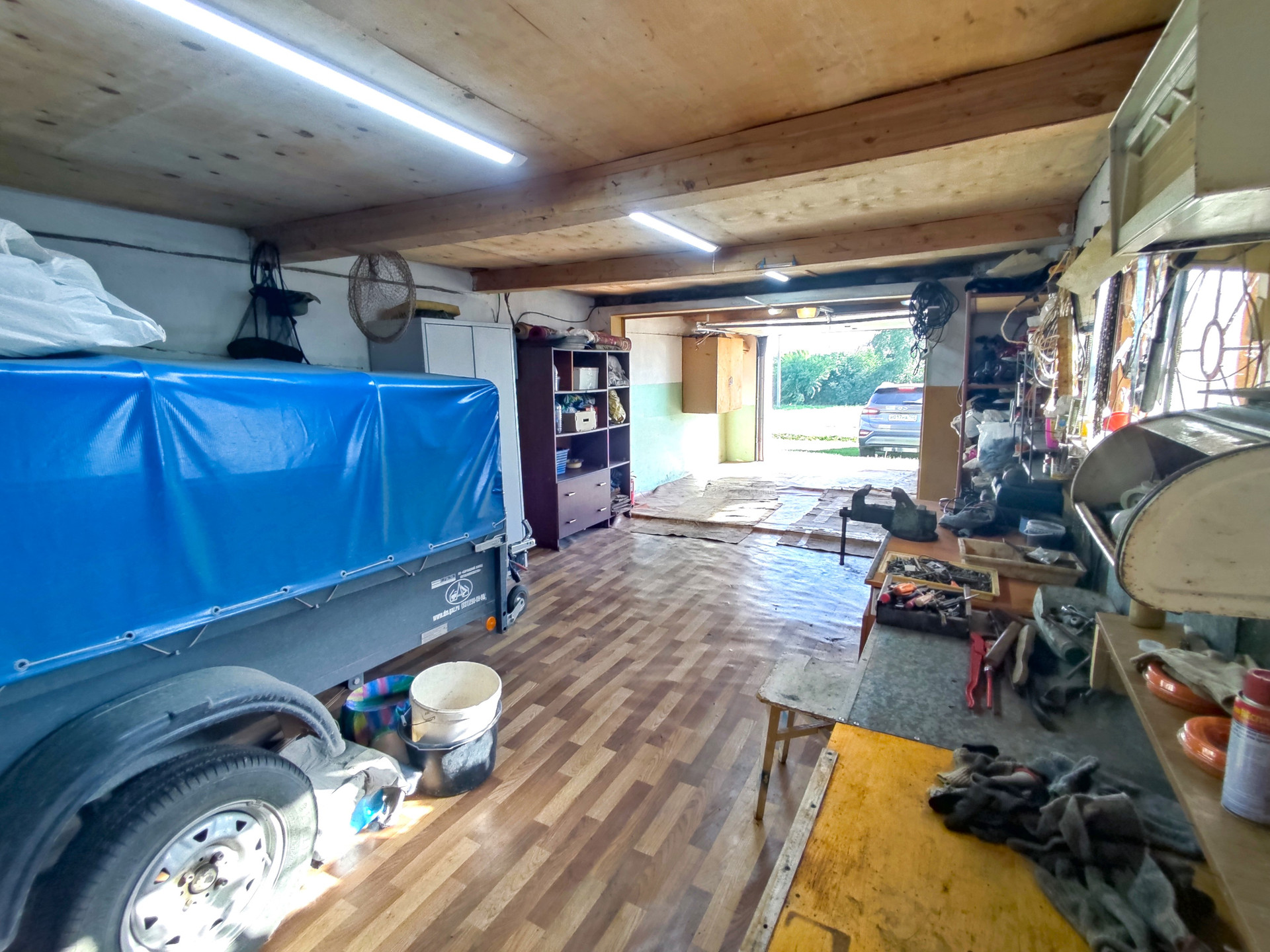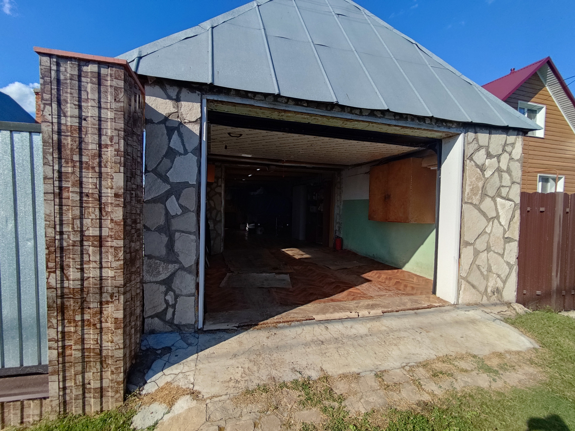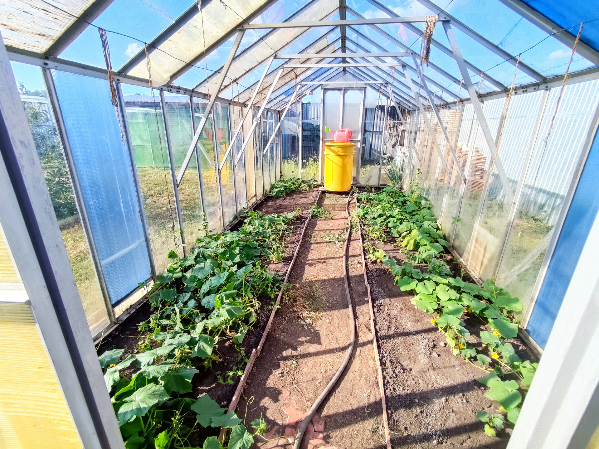 На участке имеется 2 стеклянные теплицы, металлический гараж, складские помещения, баня, дровеник, капитальный гараж из блоков на 2 машины, погреб в гараже для хранения солений, бочки для сбора воды, 2 скважины разной глубины.