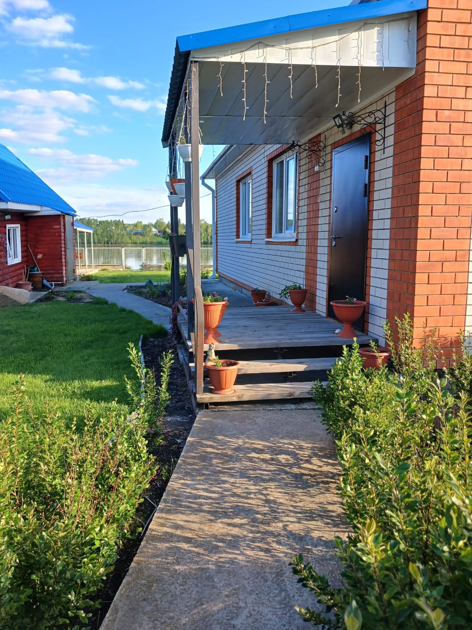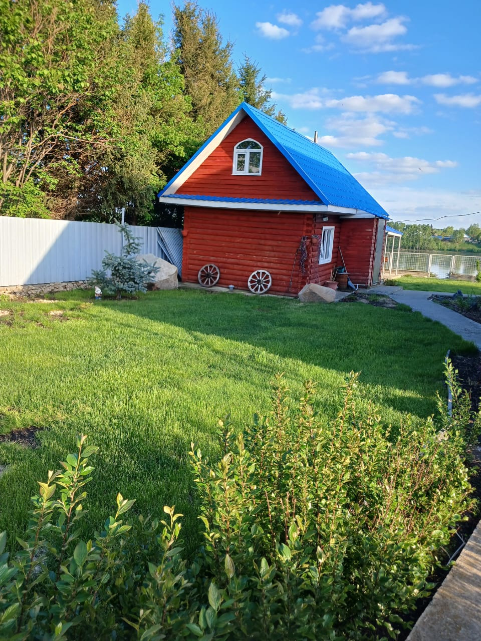 На участке 17 сот. есть кирпичный гараж (25 м.кв.), баня с комнатой отдыха, беседка, теплица, огород, плодовые деревья и голубая ель.