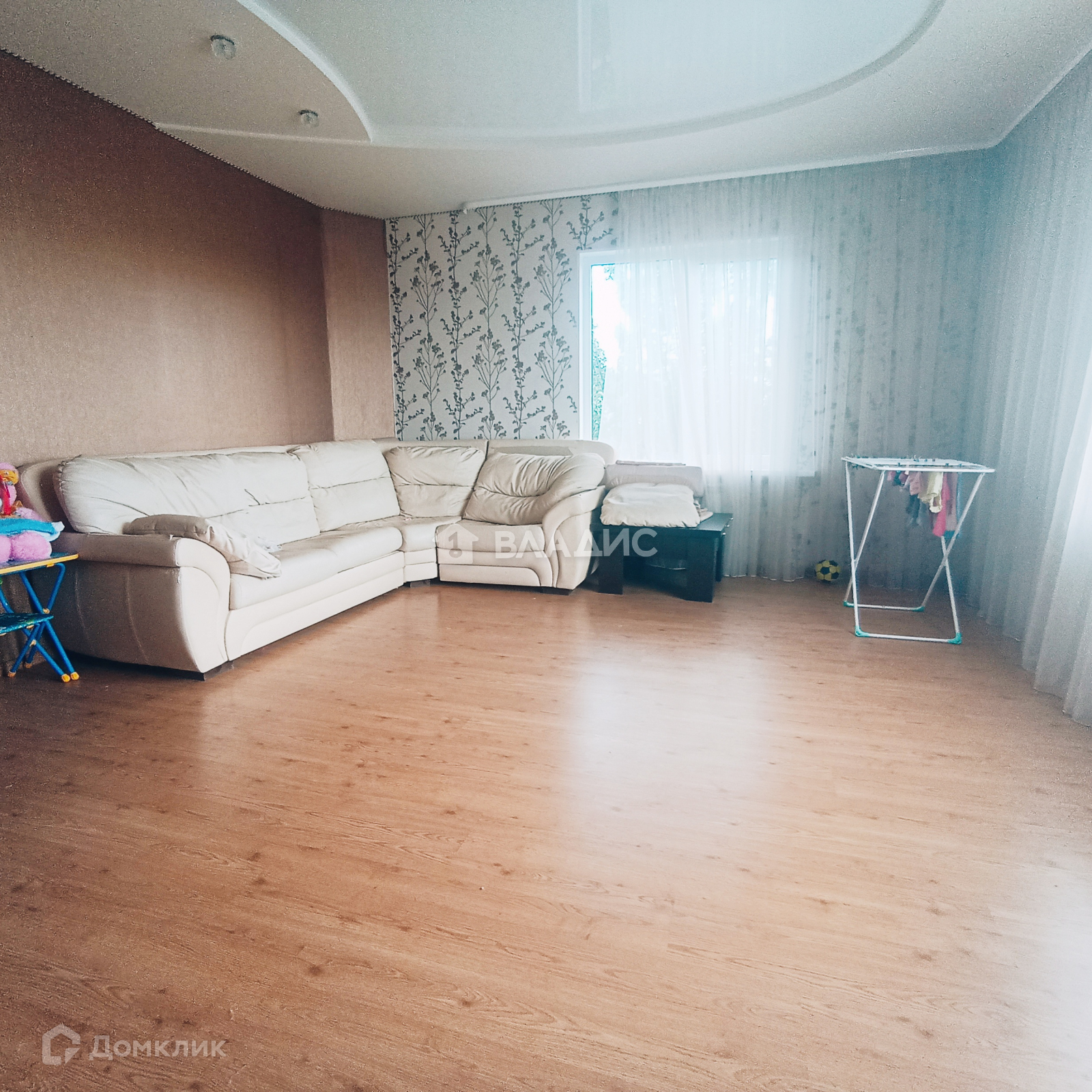 В доме сделан косметический ремонт - в комнатах аккуратные обои, СУ в хорошей плитке, везде натяжной потолок с декором.